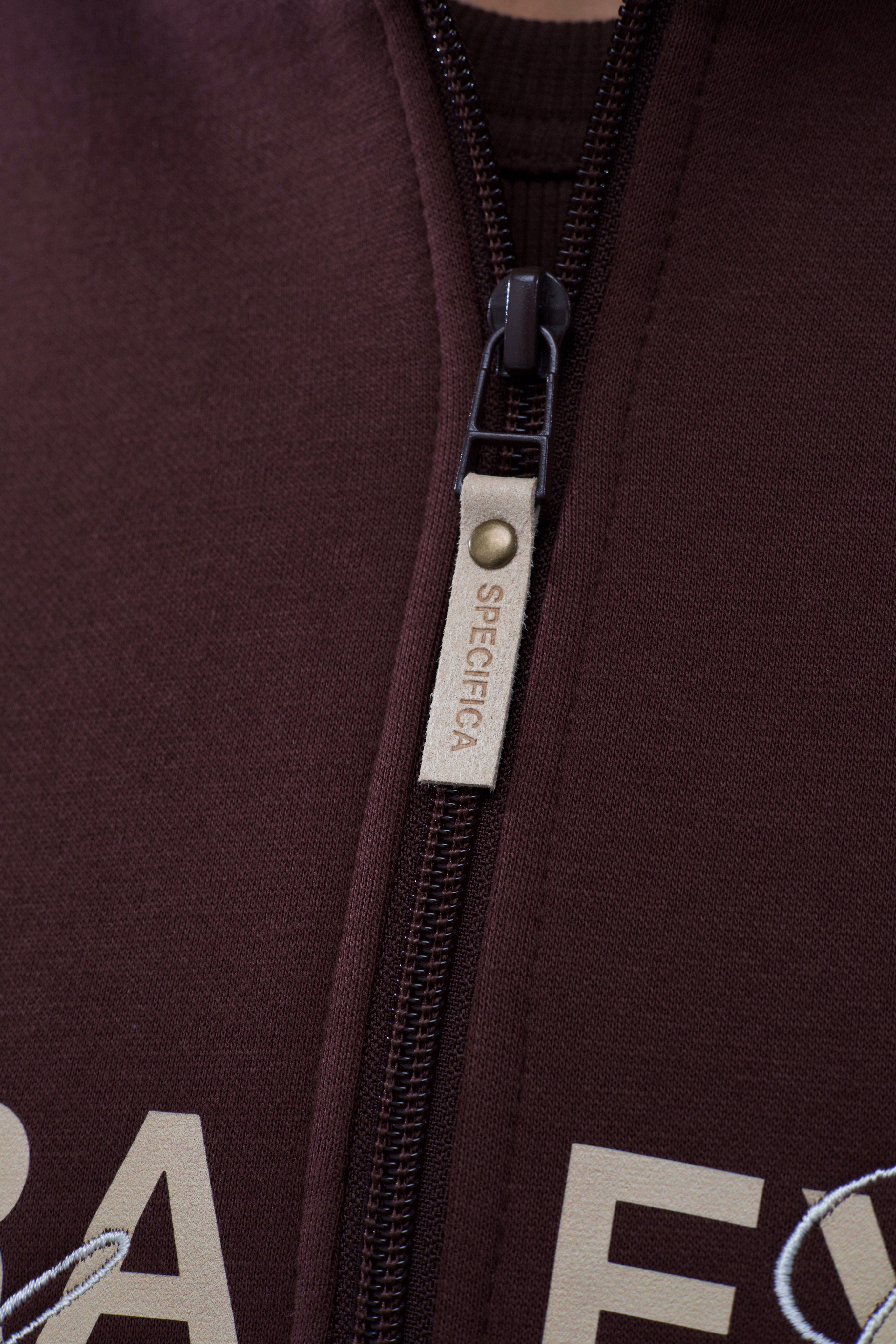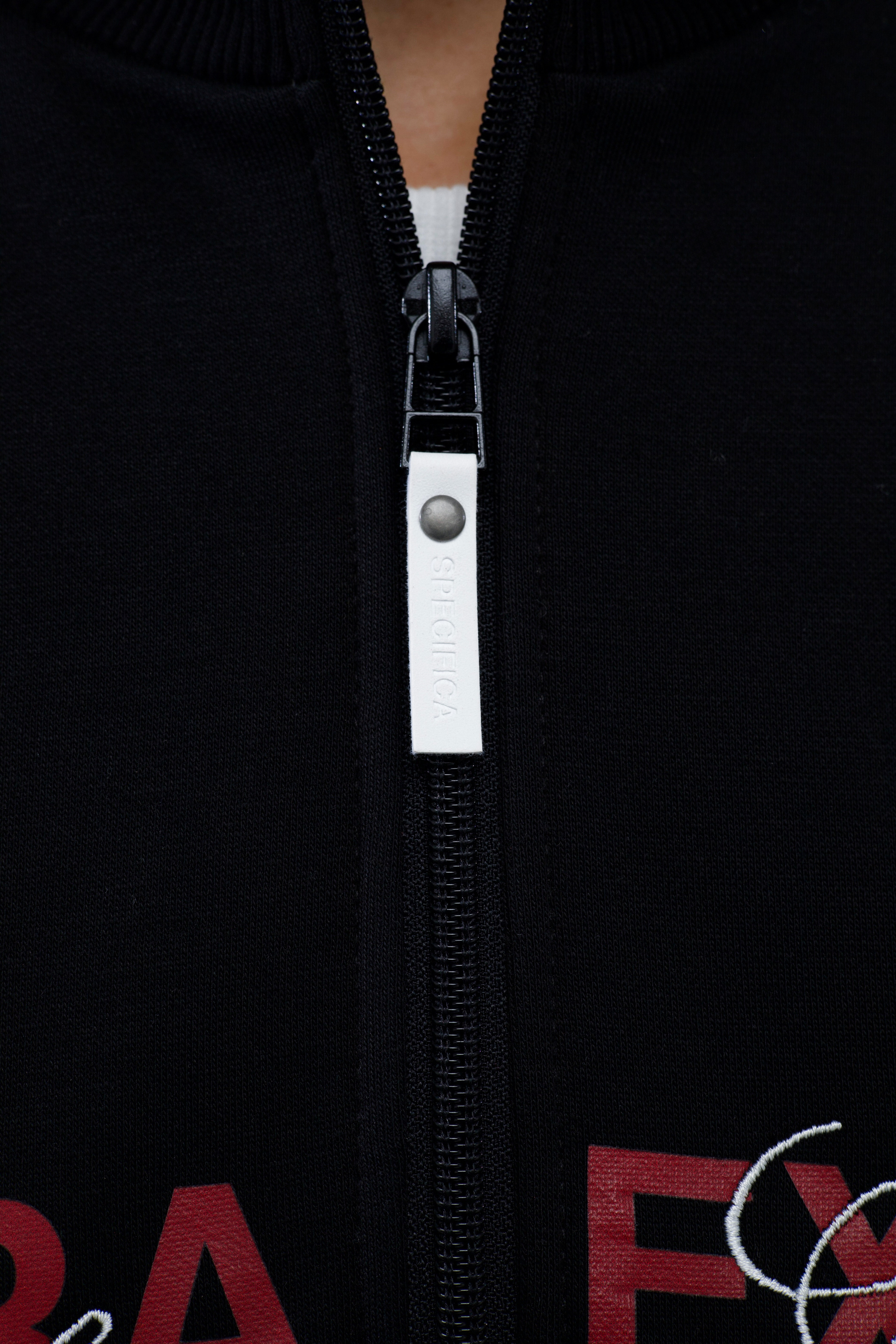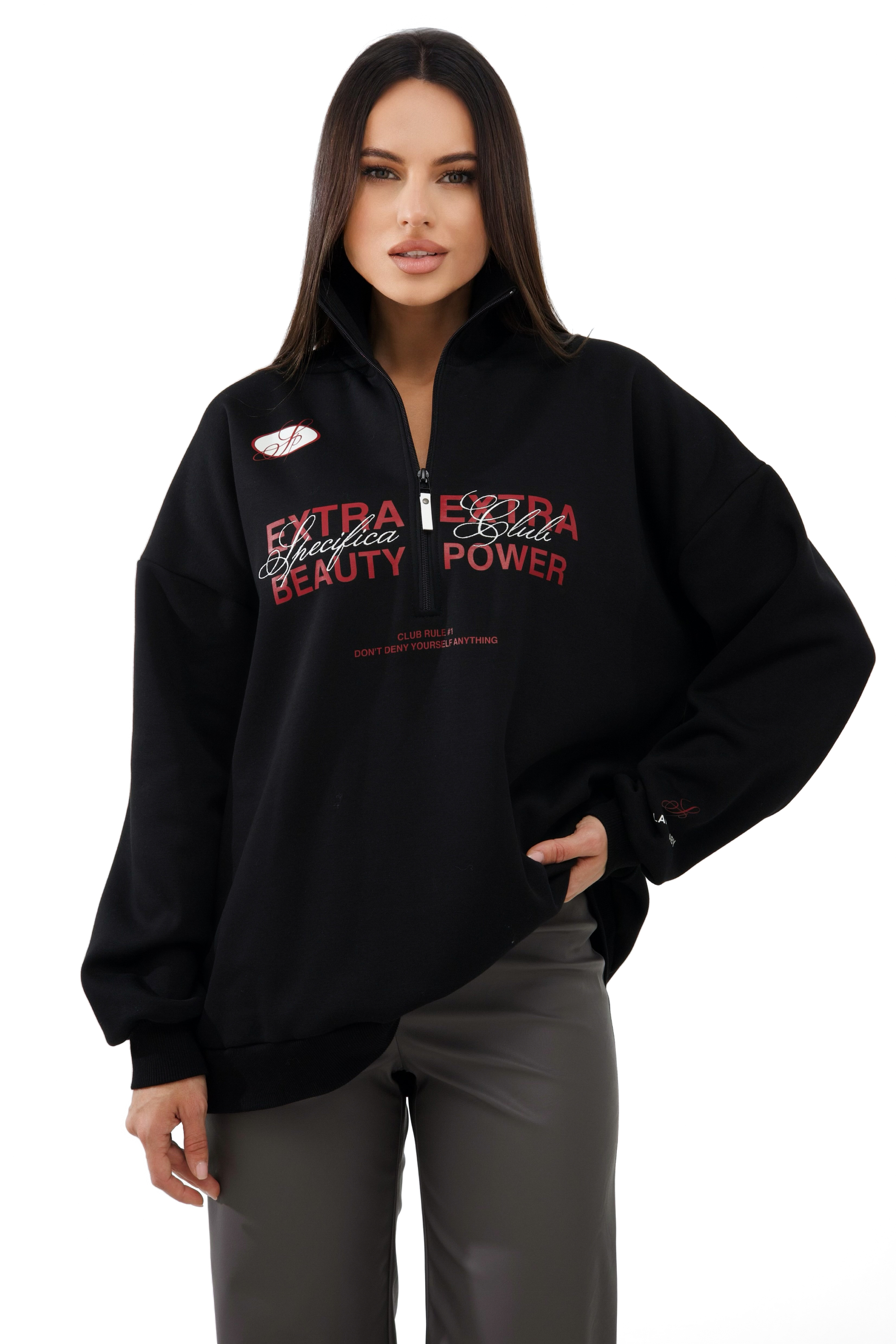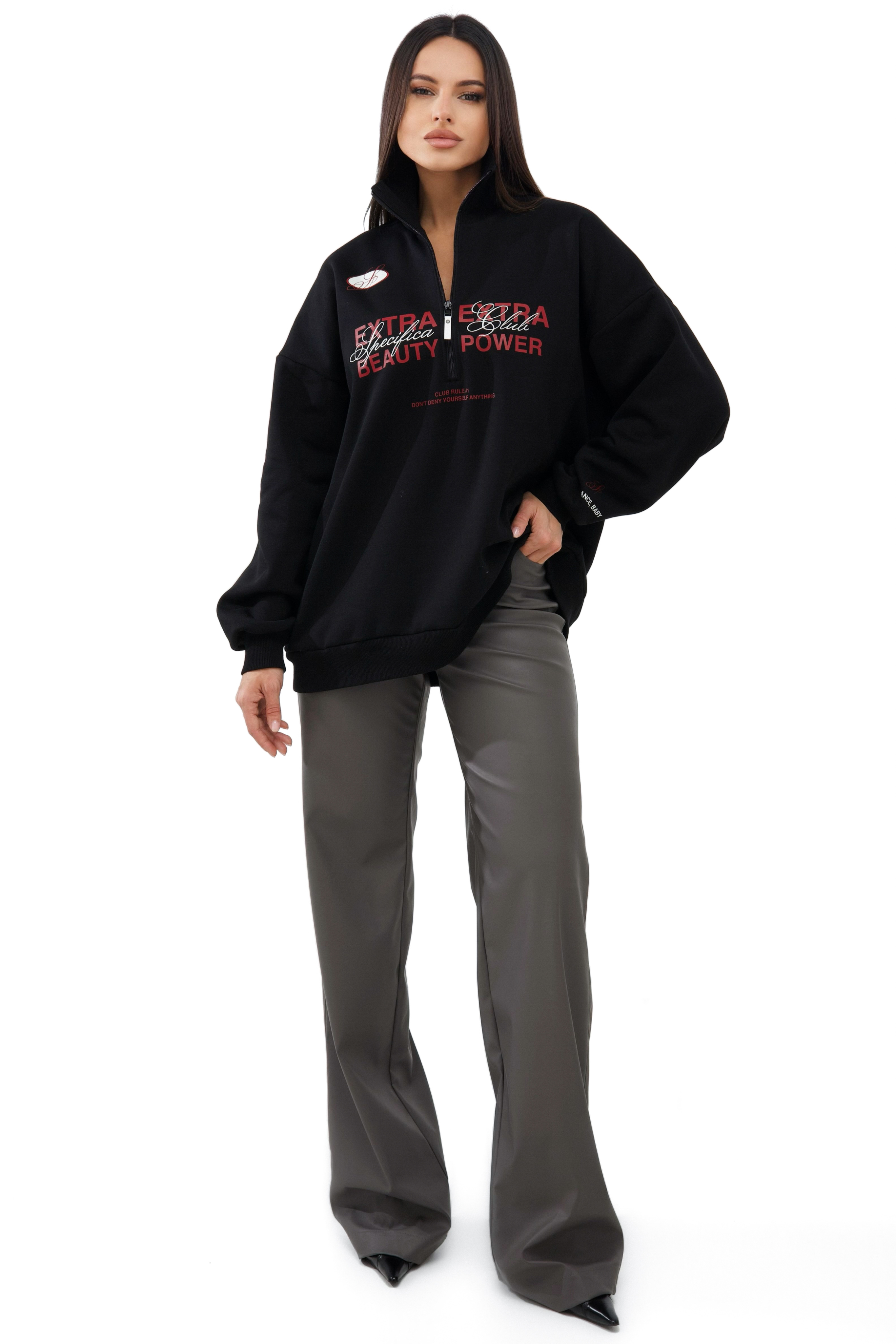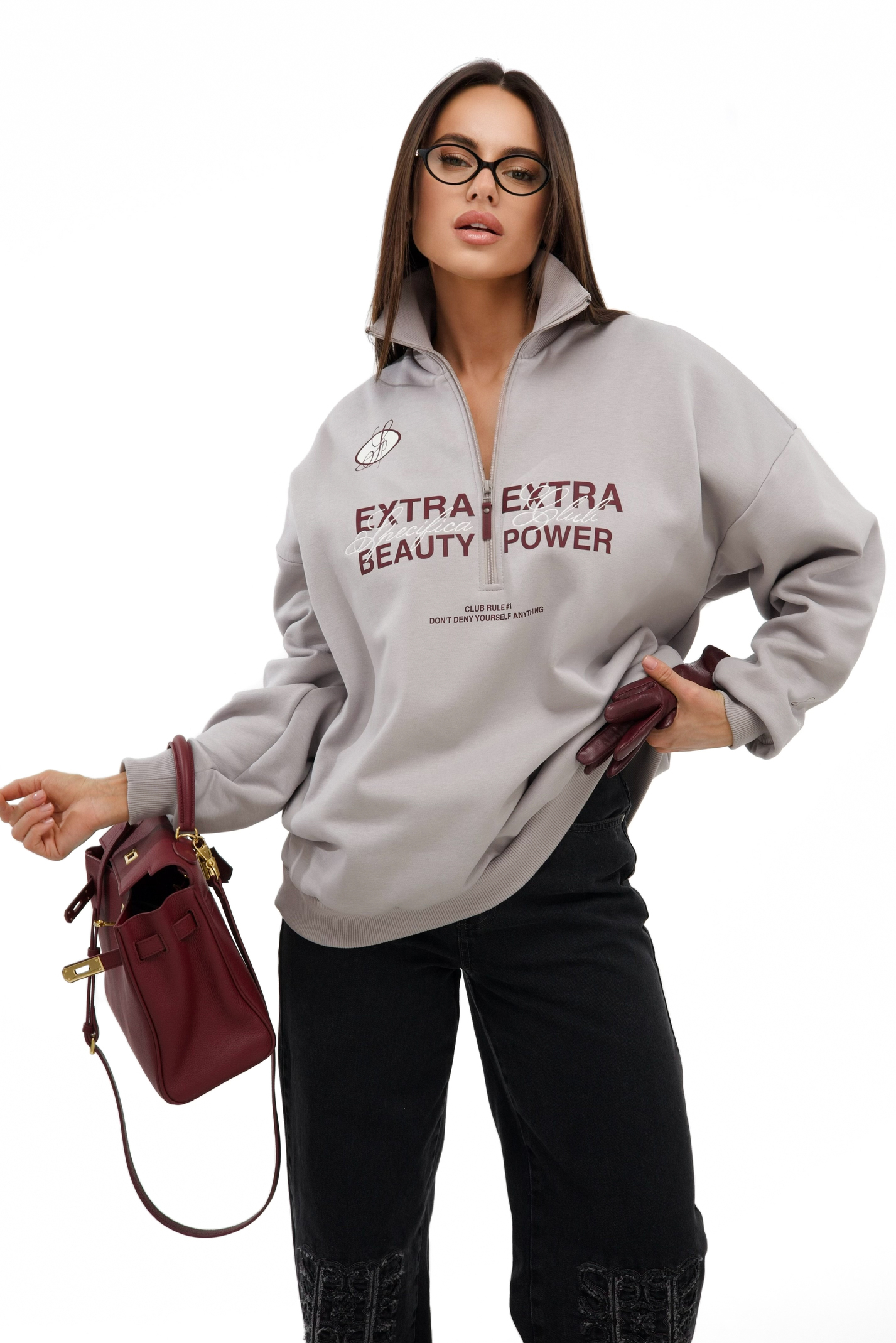 Свободный крой без гиперобъема, фирменная надпись на груди, воротник-стойка.