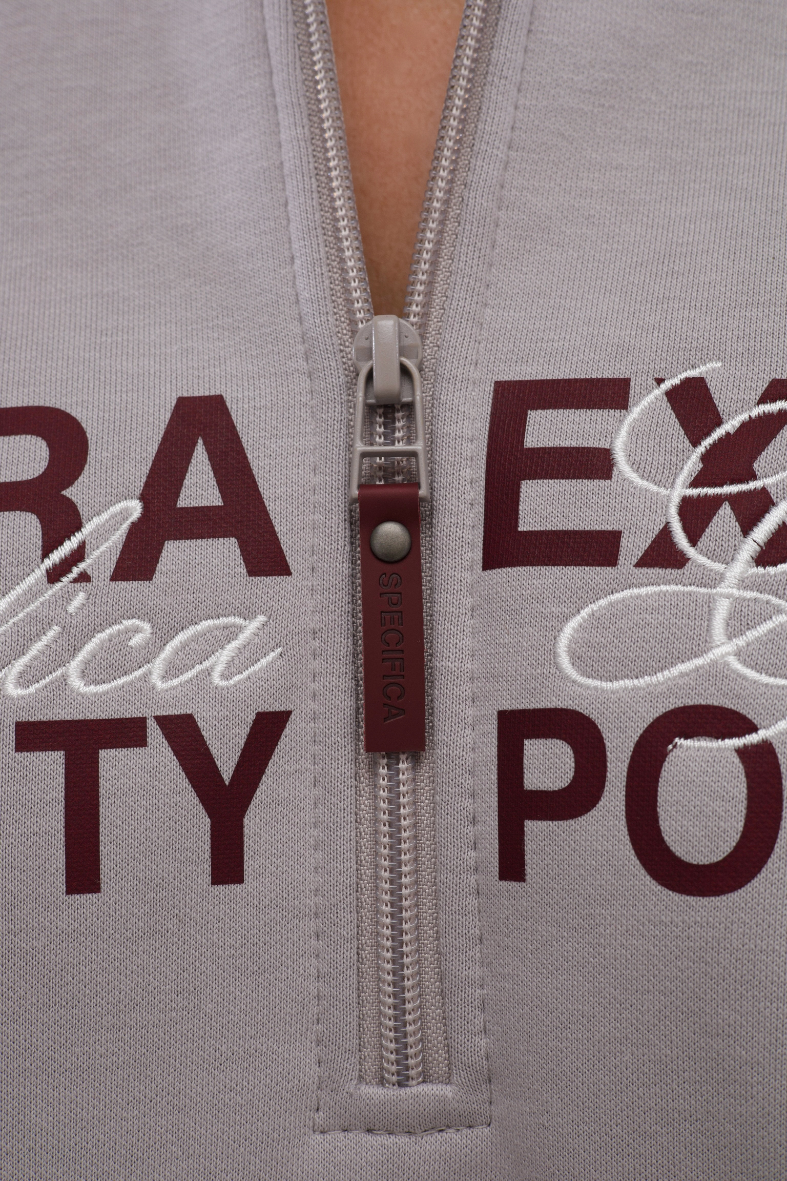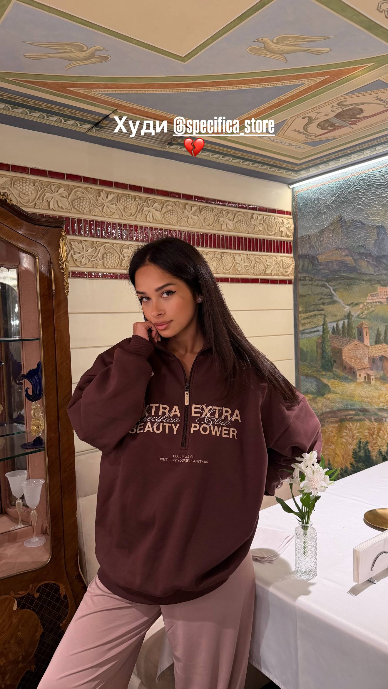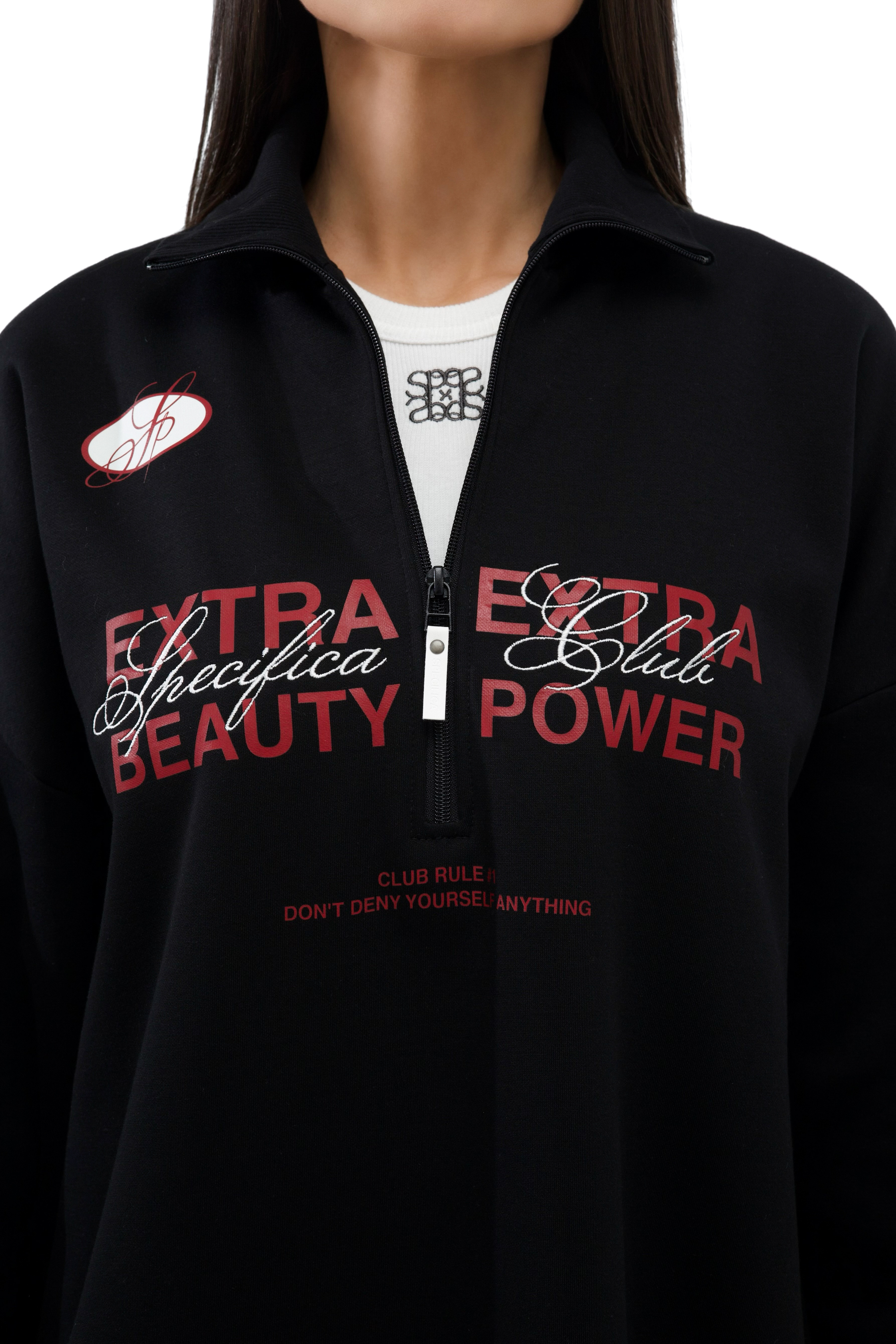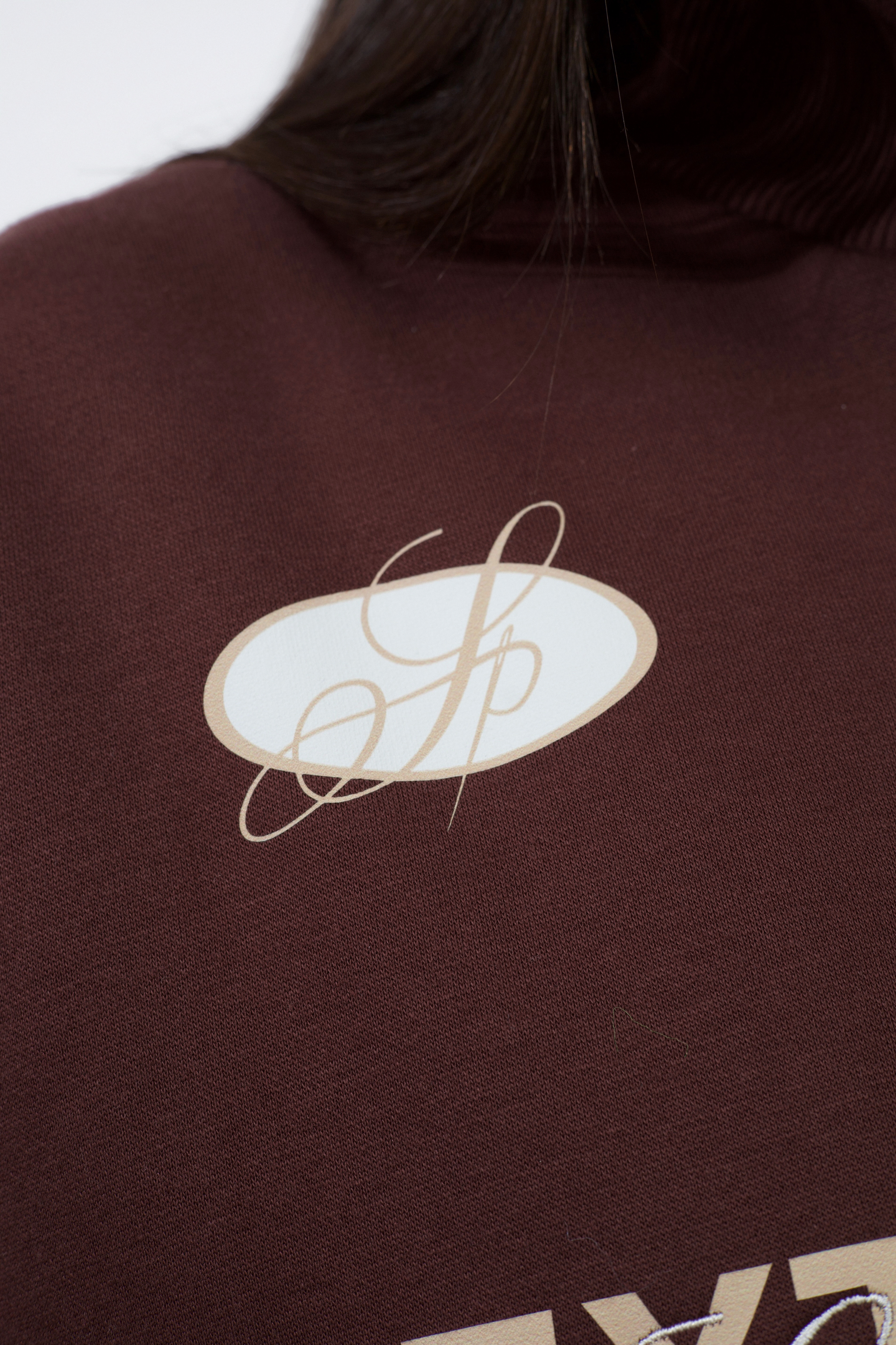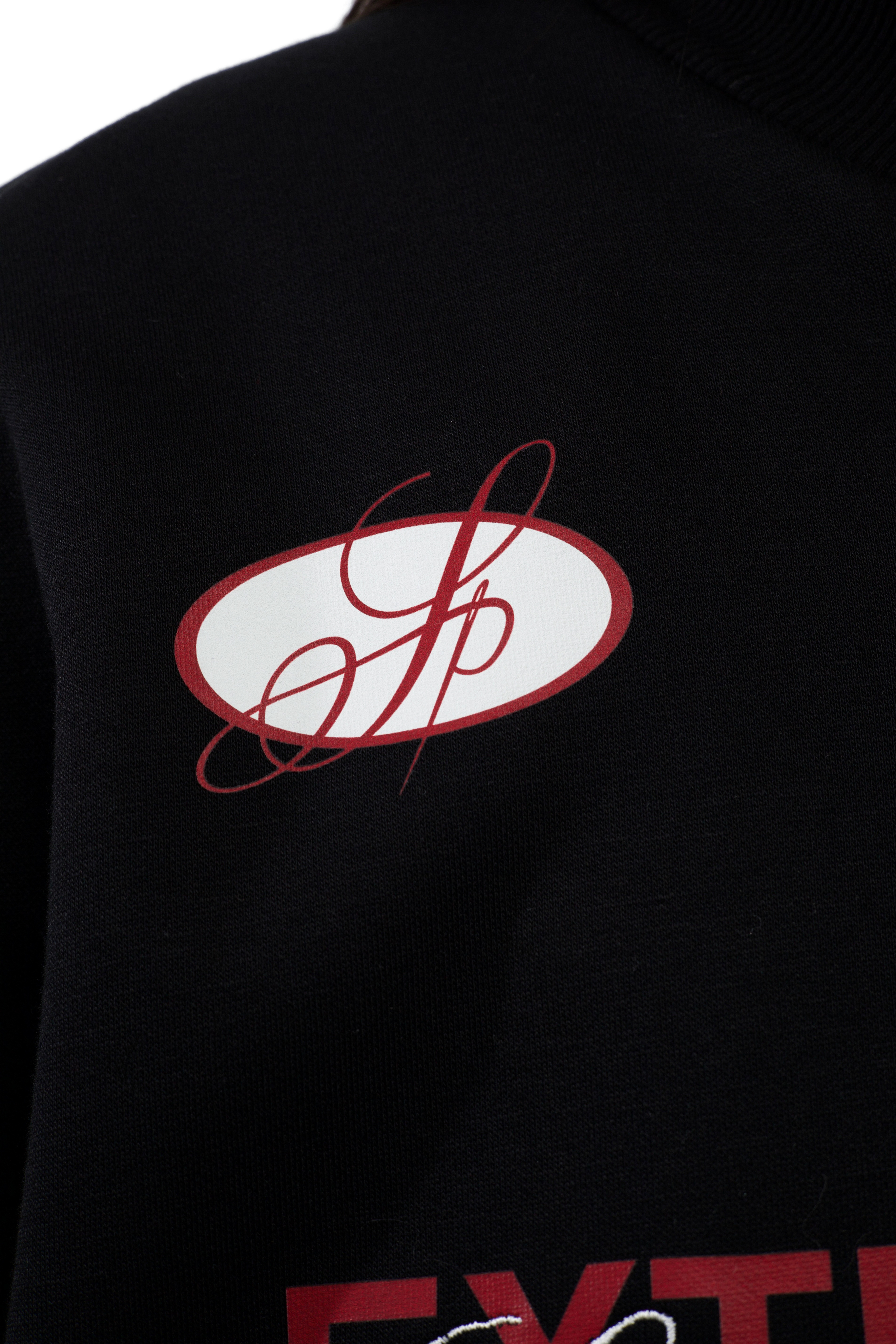 Свободный крой без гиперобъема, фирменная надпись на груди, воротник-стойка.