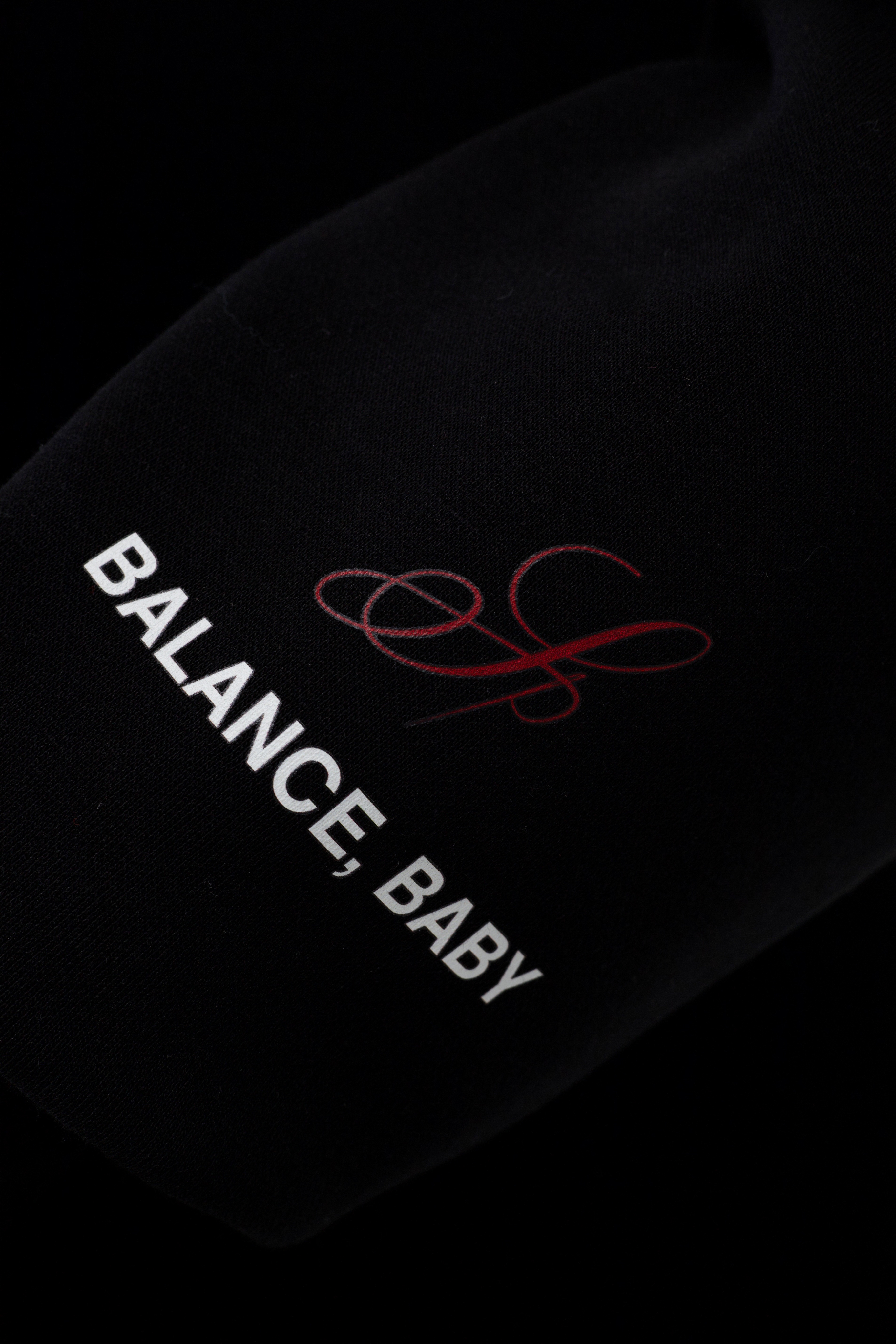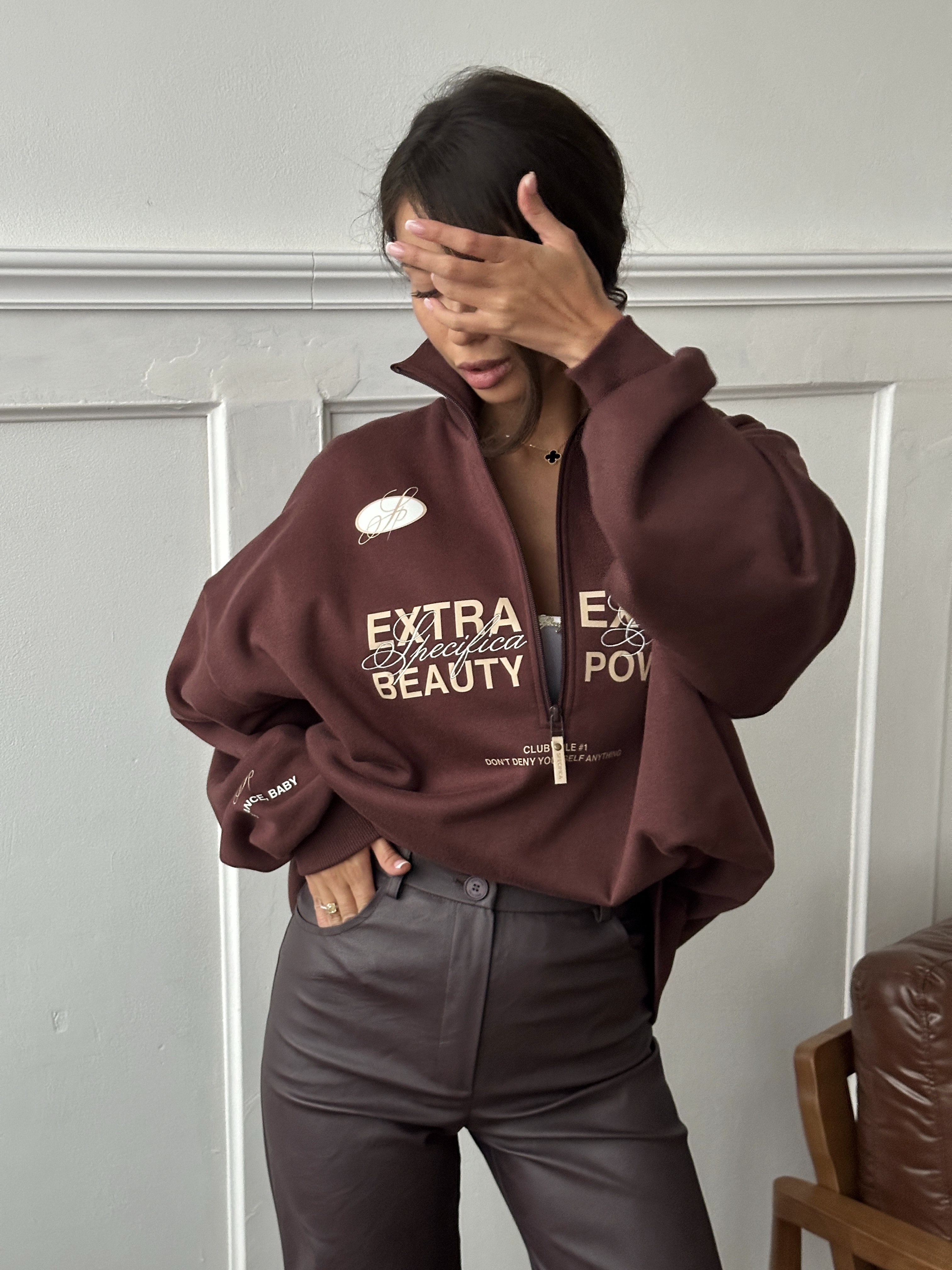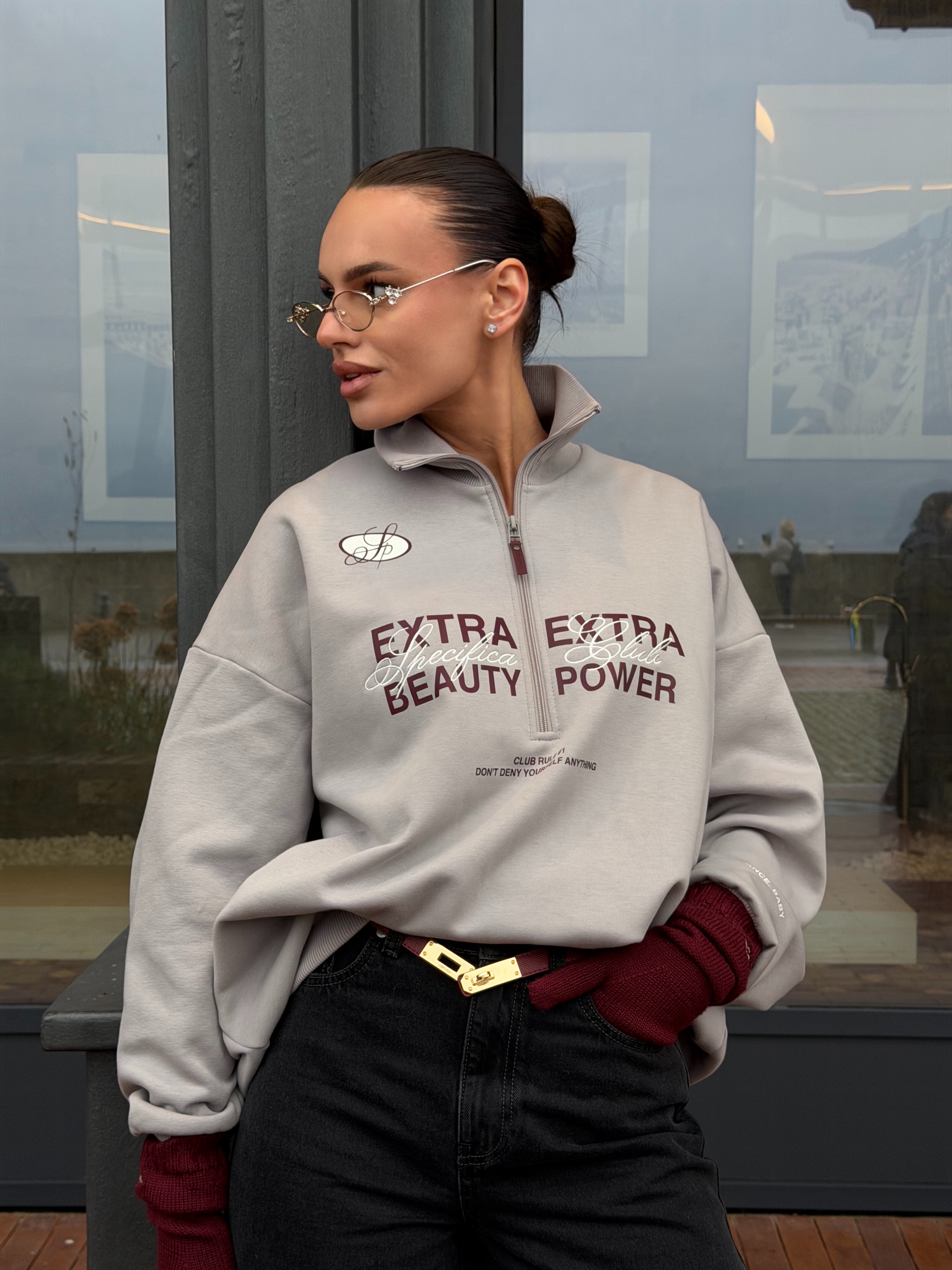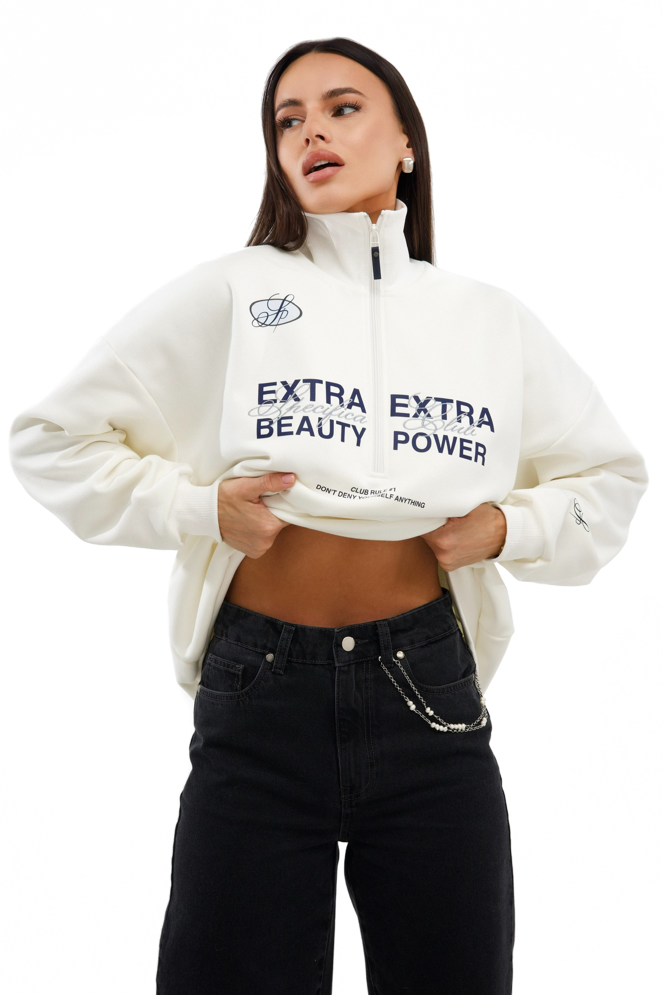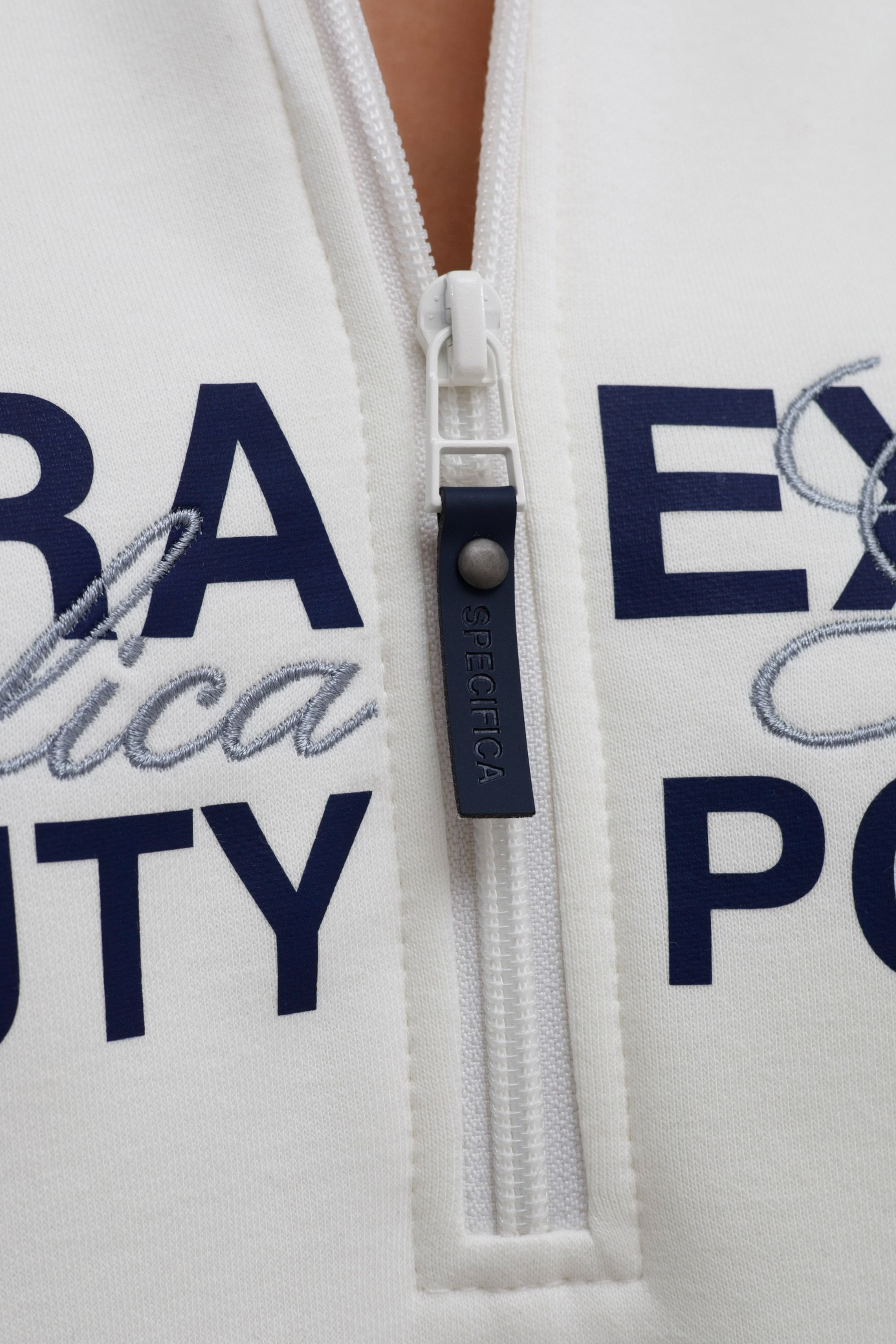 Свободный крой без гиперобъема, фирменная надпись на груди, воротник-стойка.