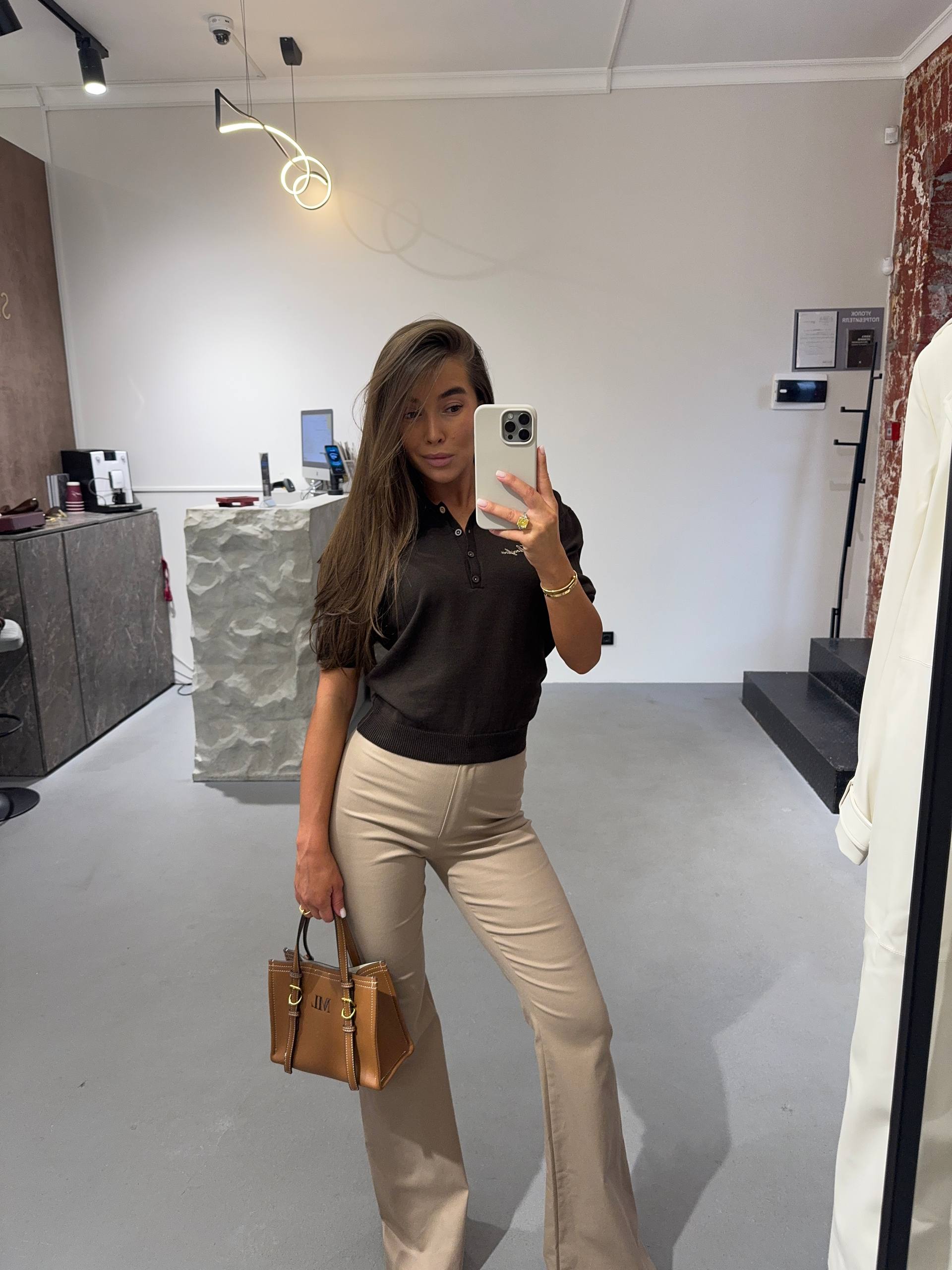 Брюки имеют приятный бежевый оттенок, идеально подчеркивают талию и линию бедер, создавая женственный и привлекательный силуэт.