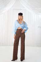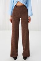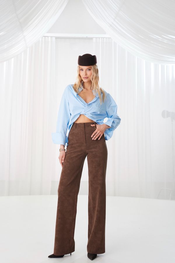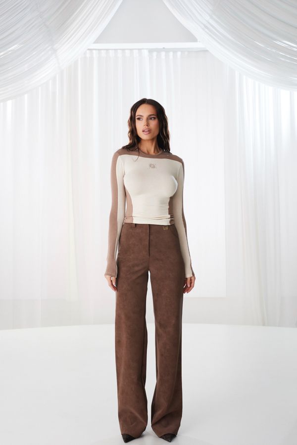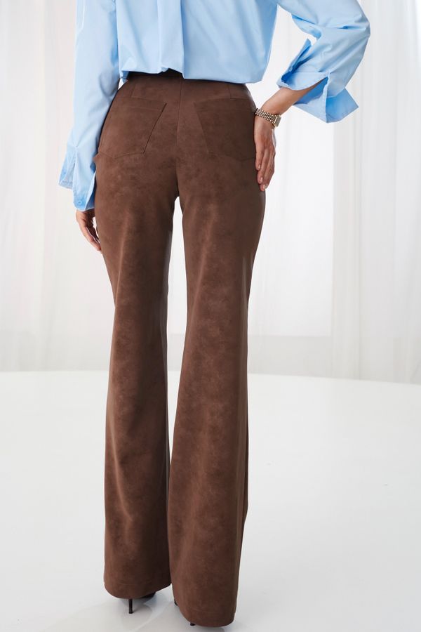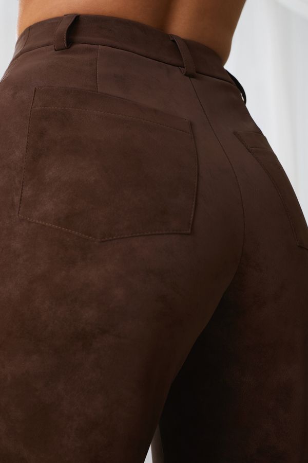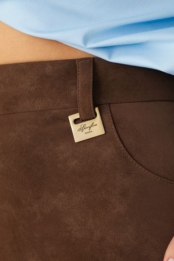 Брюки выполнены из премиальной эко-кожи под замшу в двух универсальных оттенках.