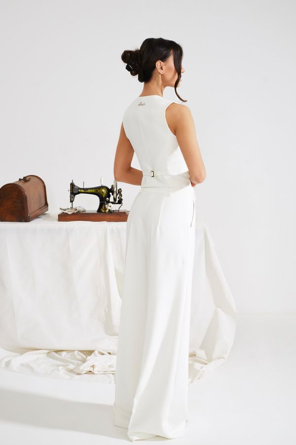 Брюки со стрелками в молочном оттенке.