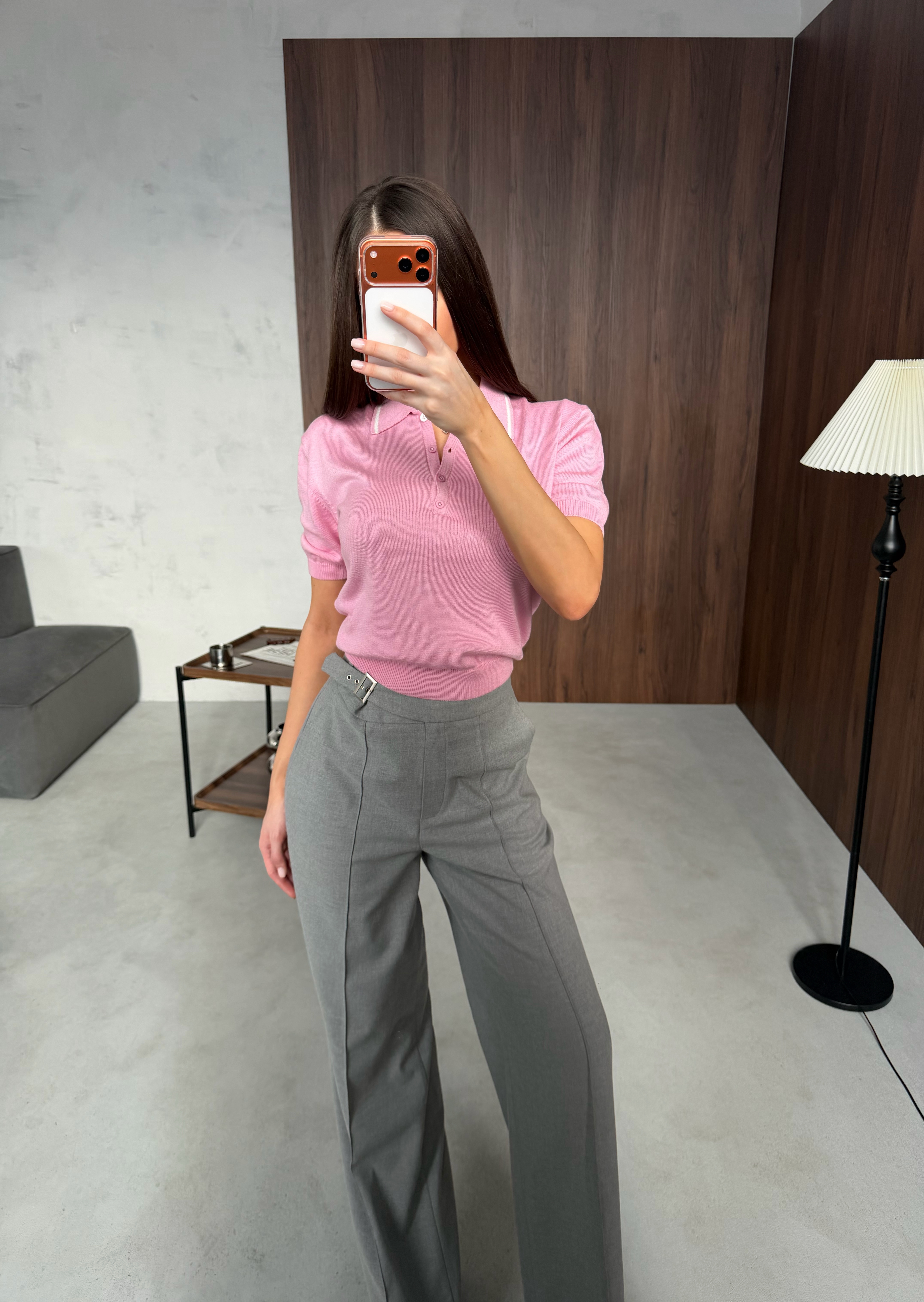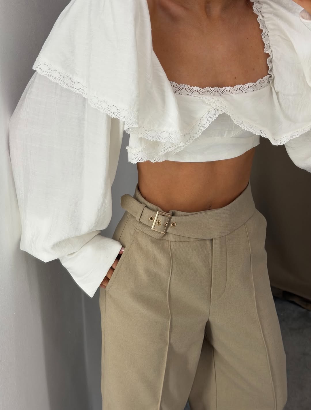 Акцентный пояс и четко выделенные стрелки выигрышно подчеркивают стройность ног и талию, создавая элегантный силуэт.