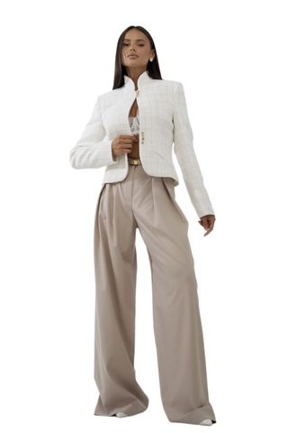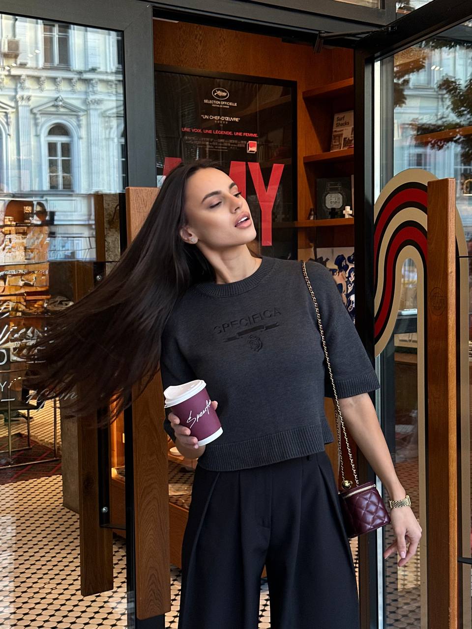 Укороченный фасон с коротким рукавом подчеркивает современный городской стиль, а прямой силуэт обеспечивает свободу движений и универсальность в сочетаниях.