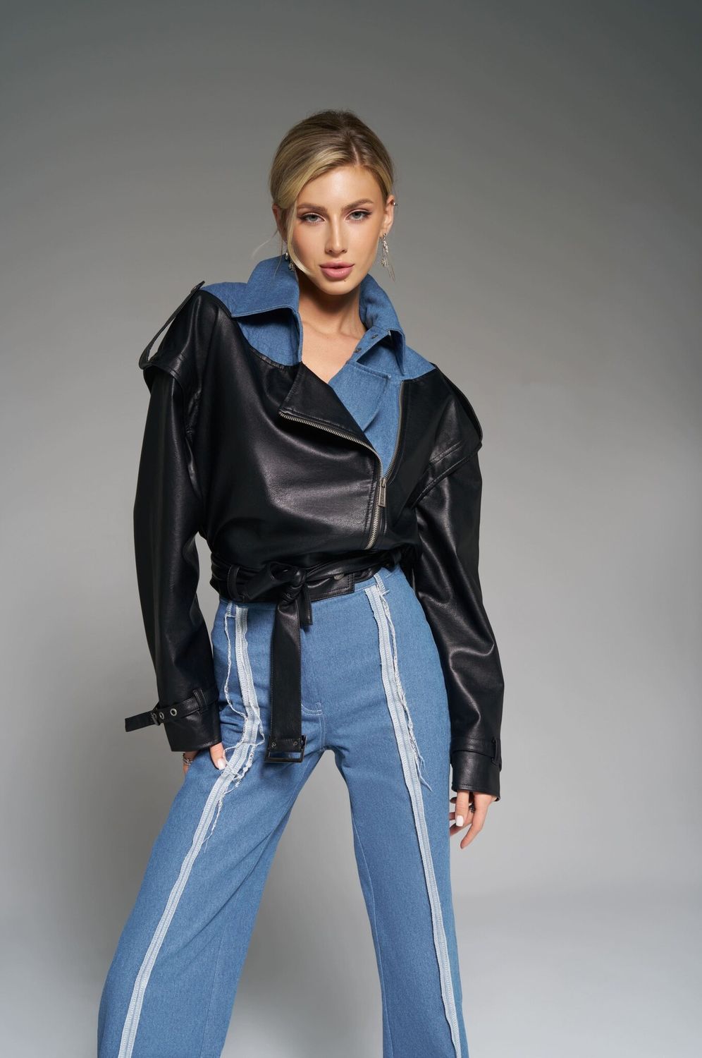 Имитация швов наружу придает наряду неповторимую изюминку и создает эффектный контраст с синим денимом.