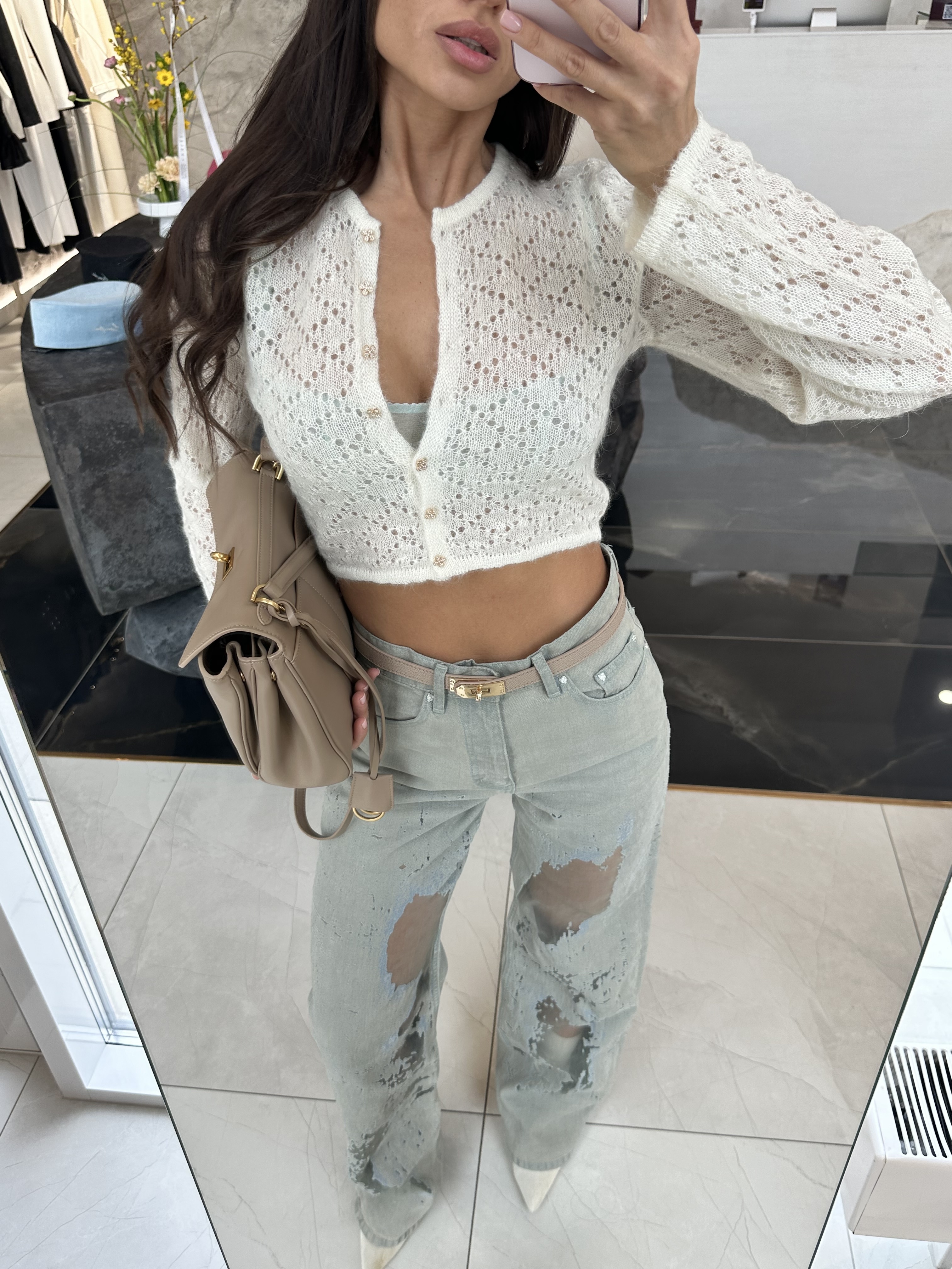 Мы сами создали такой индивидуальный цвет джинс с помощью варки и расположили вставки из органзы так, чтобы ваши ножки выглядели ещё длиннее и стройнее.