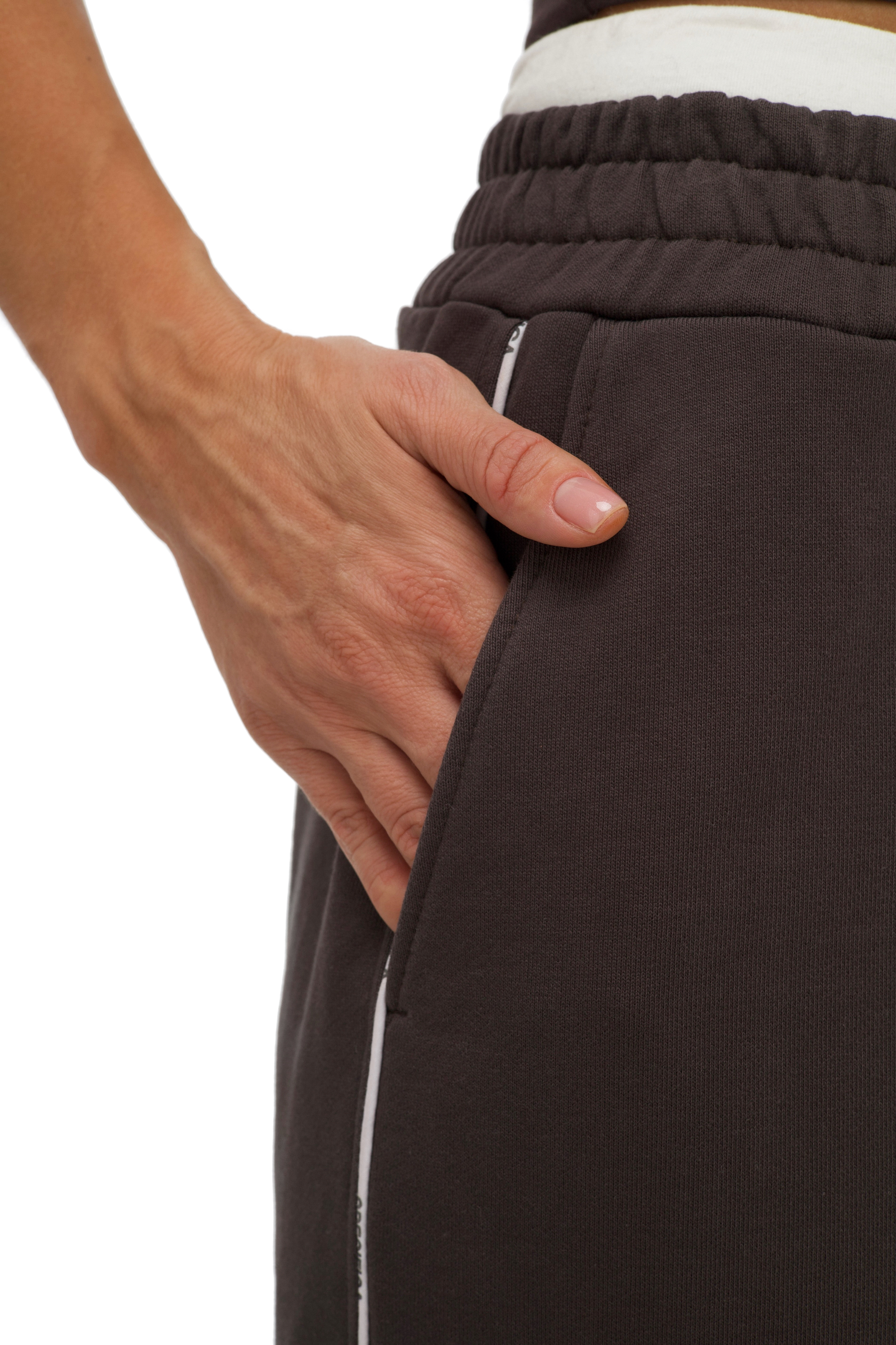 Для удобства мы сделали кулиску на брюках, с помощью которой можно регулировать их длину. Также костюм украшает контрастная полоска с логотипом бренда на зипке и брюках.