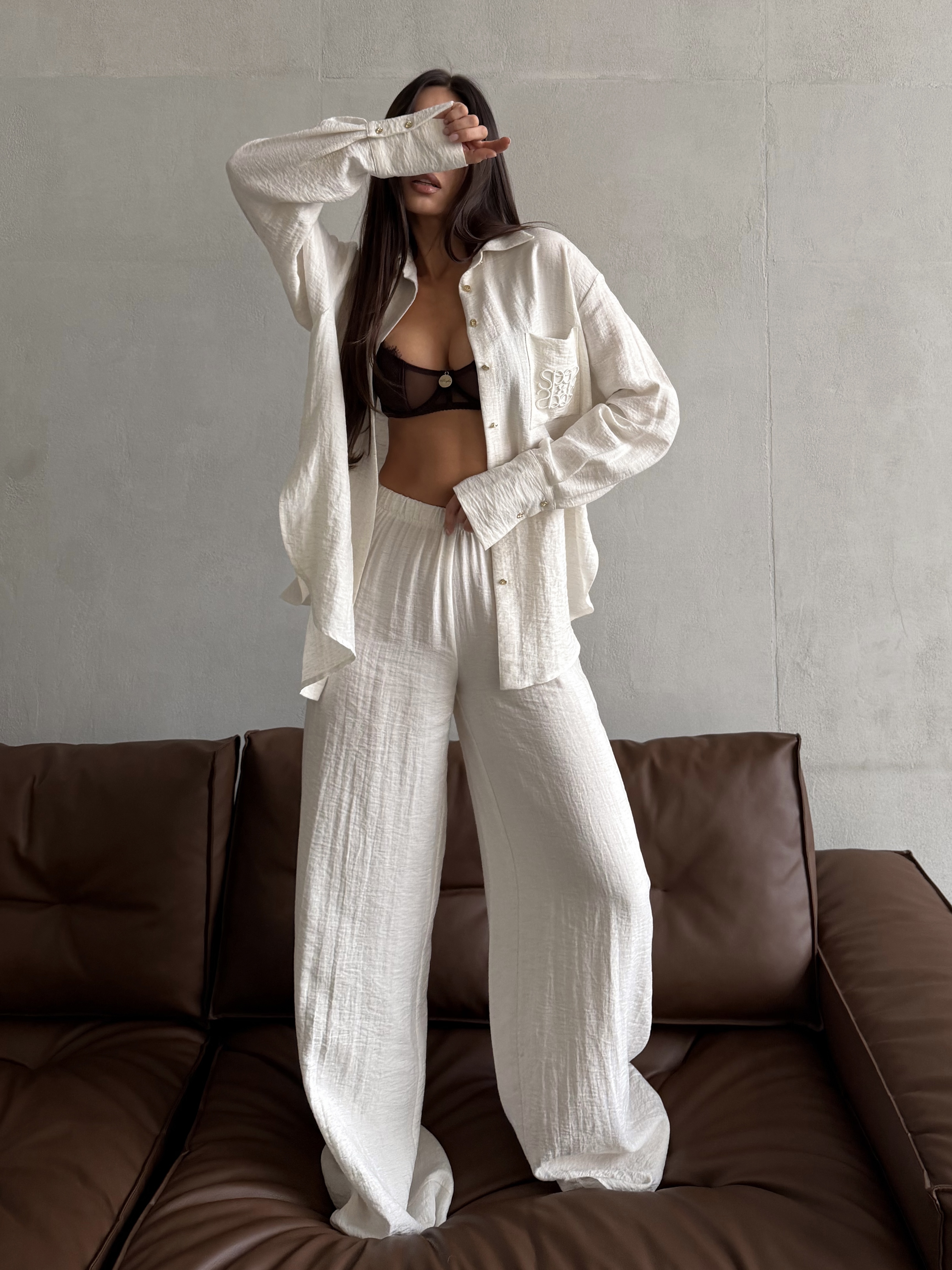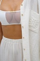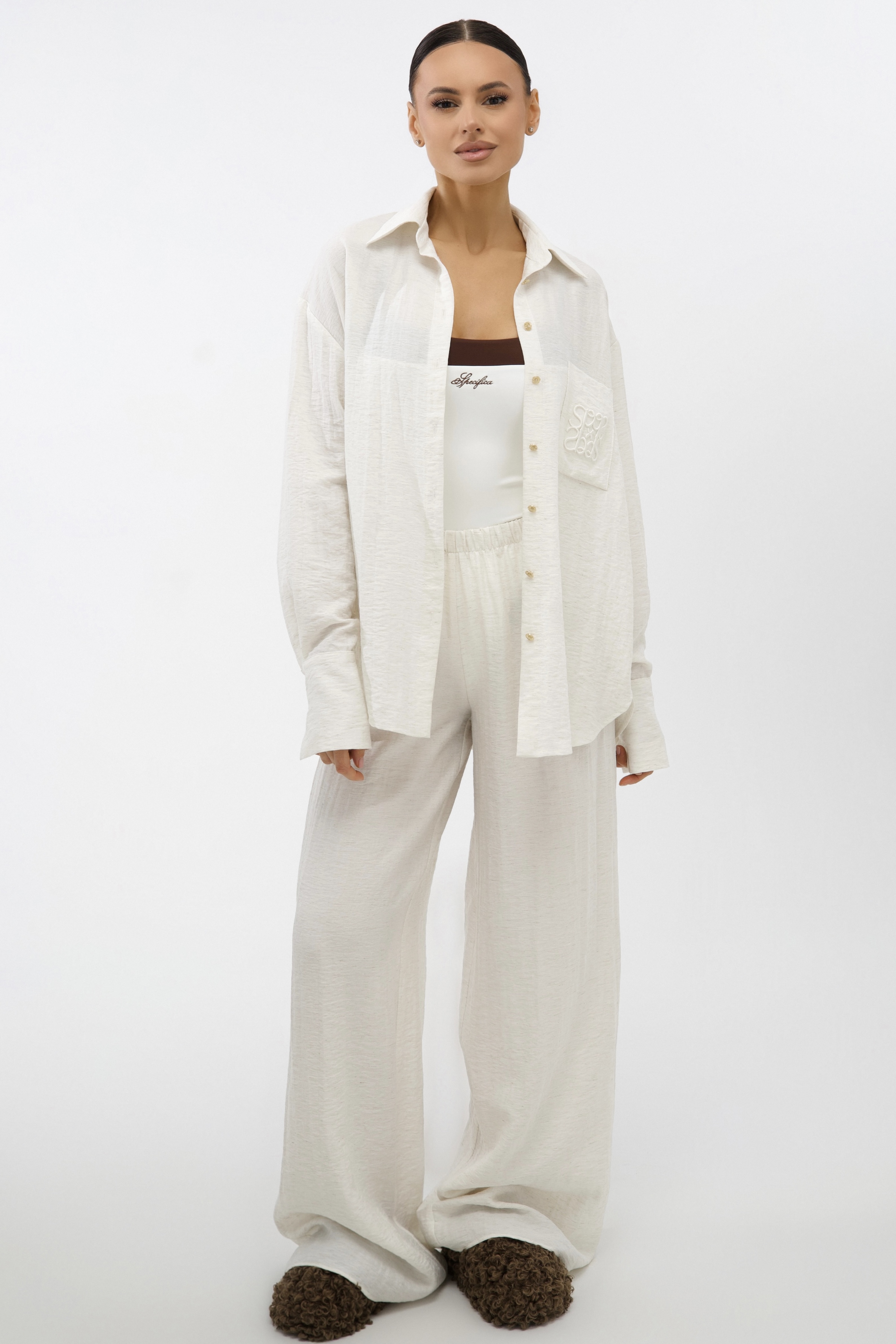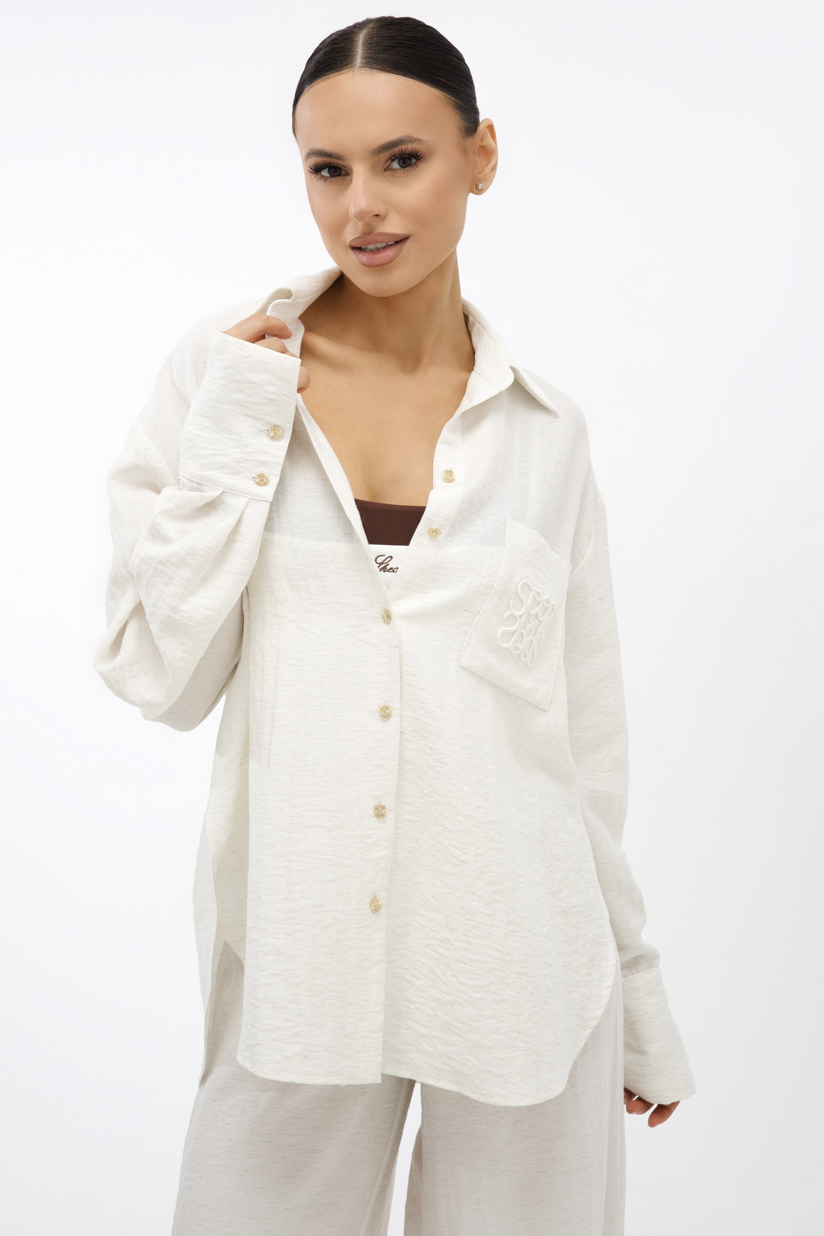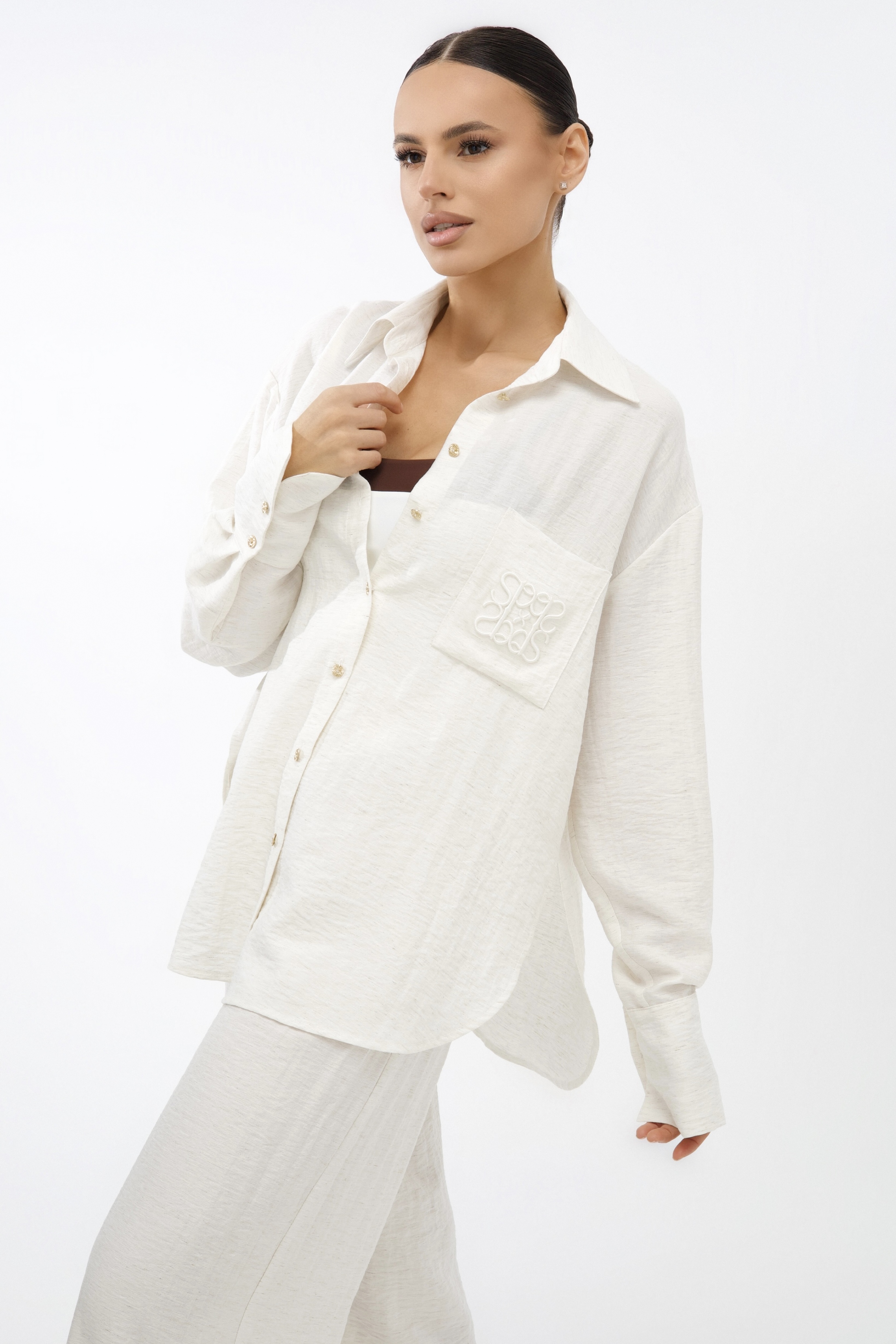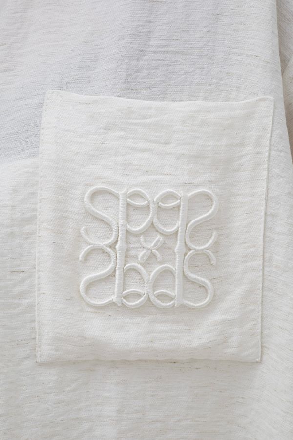 Универсальный дизайн позволяет носить рубашку свободно, подвязывая или драпируя на талии. Костюм дополняют изящные золотые пуговицы и фирменная объемная вышивка на кармане.