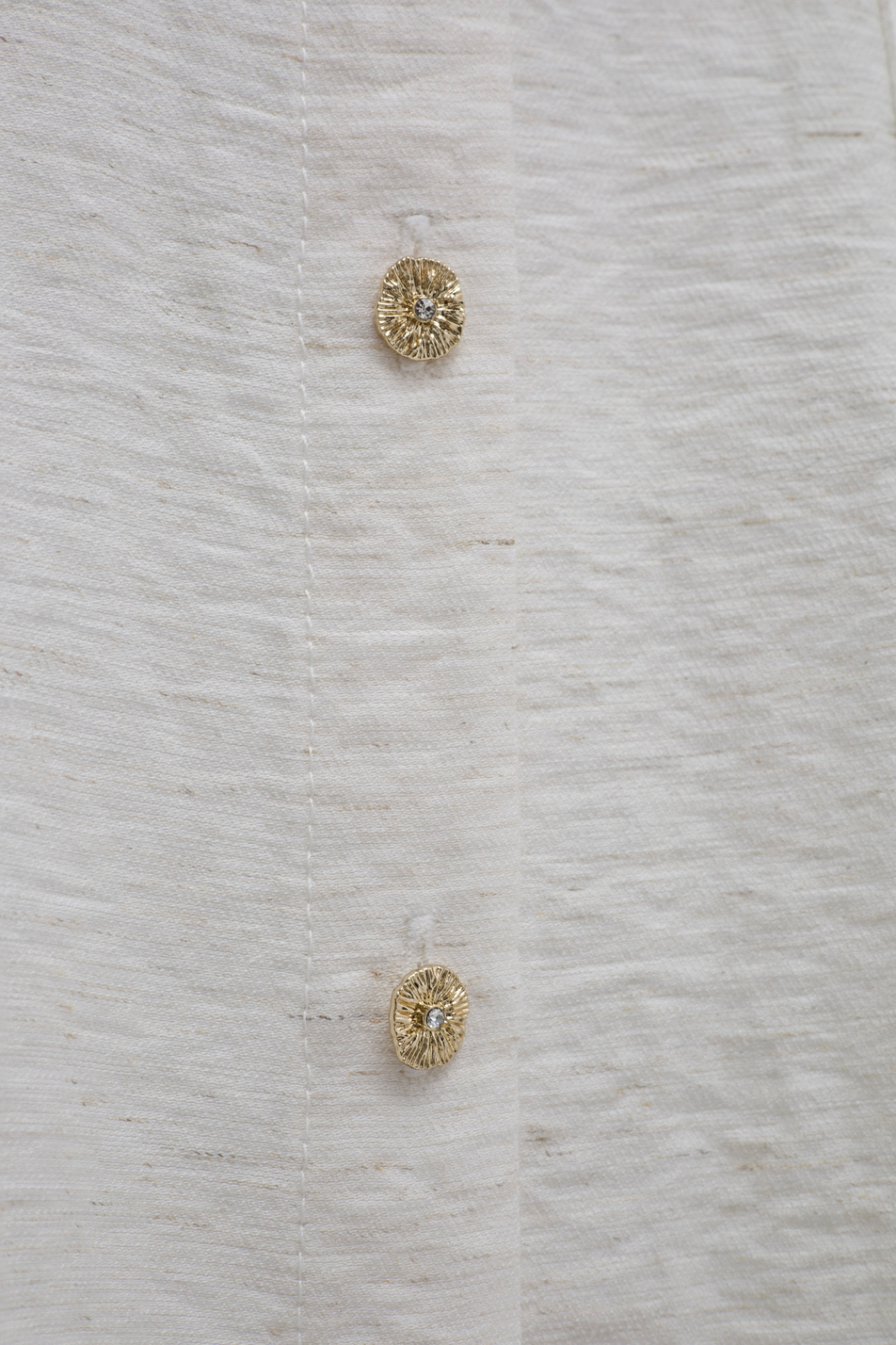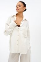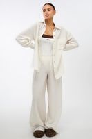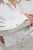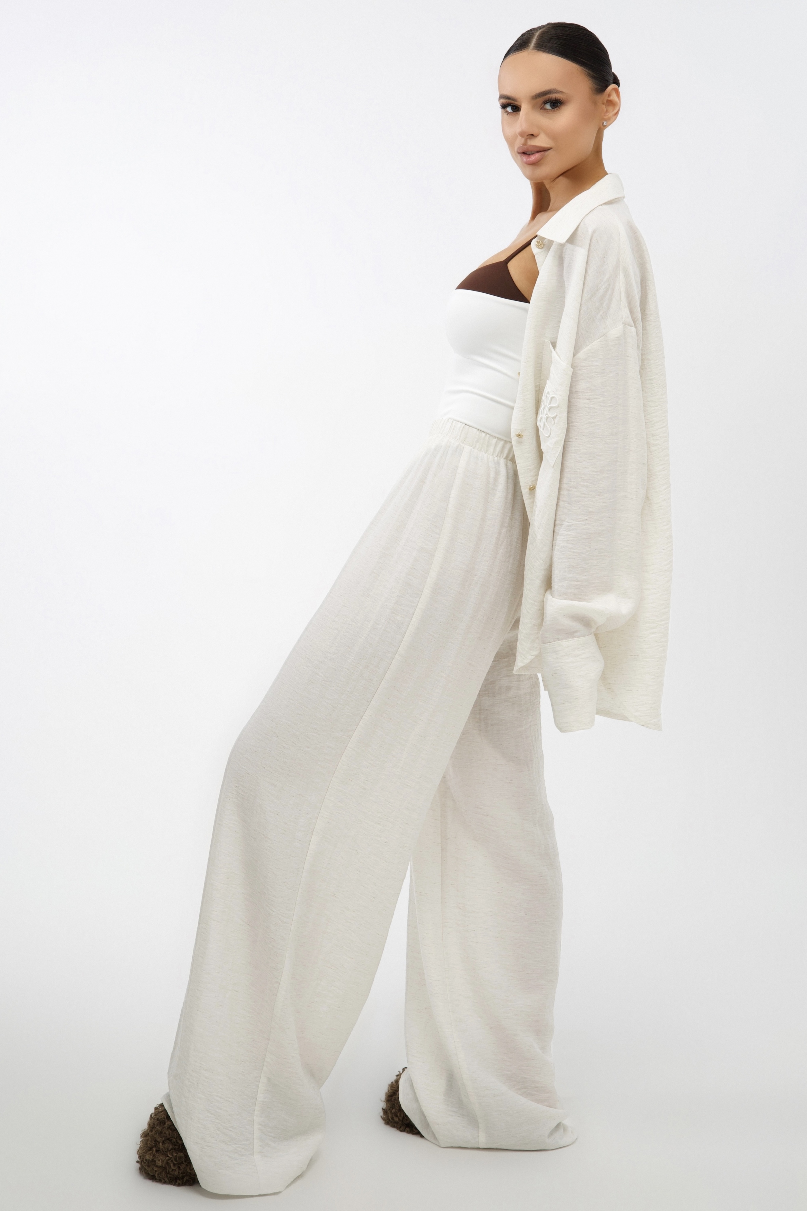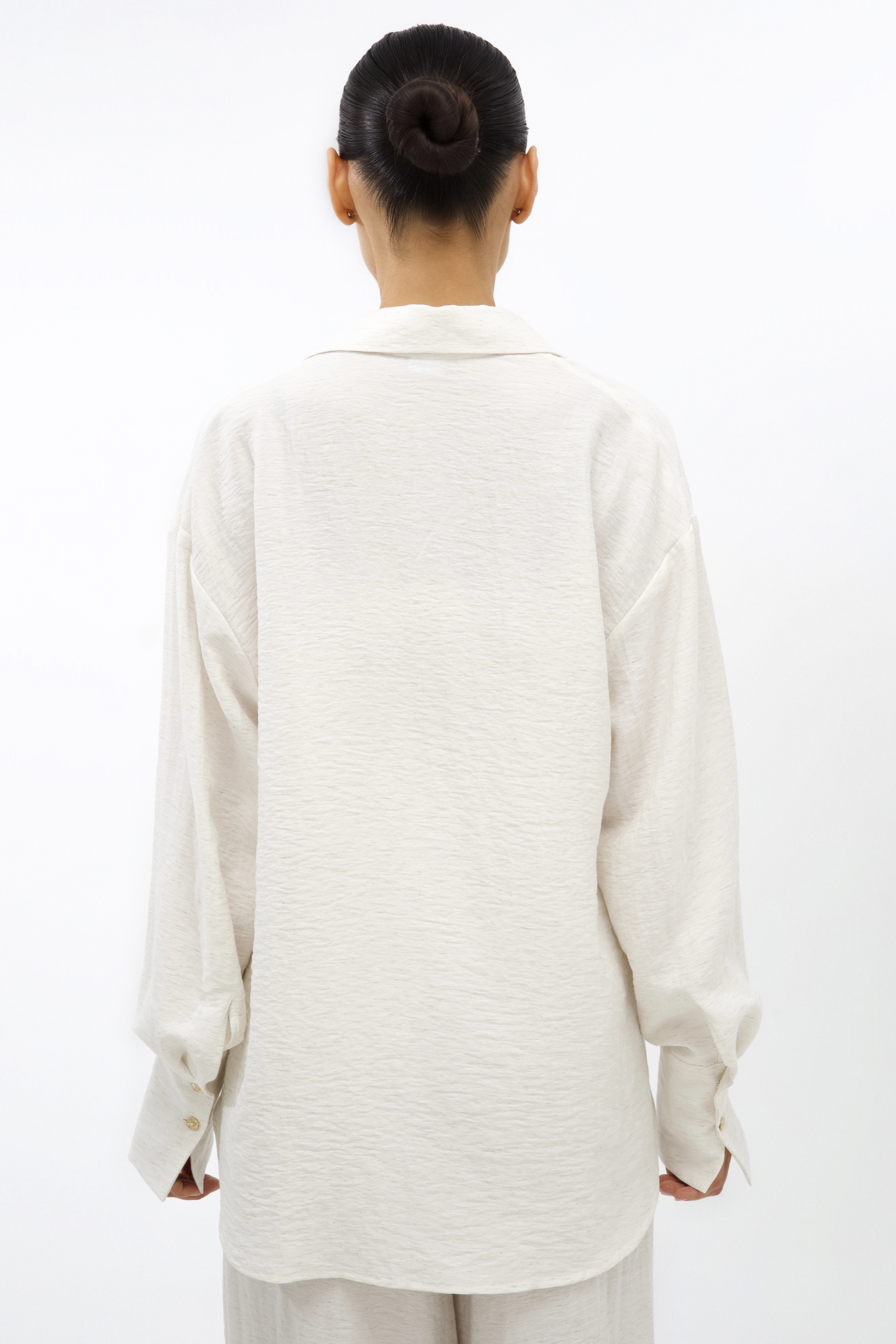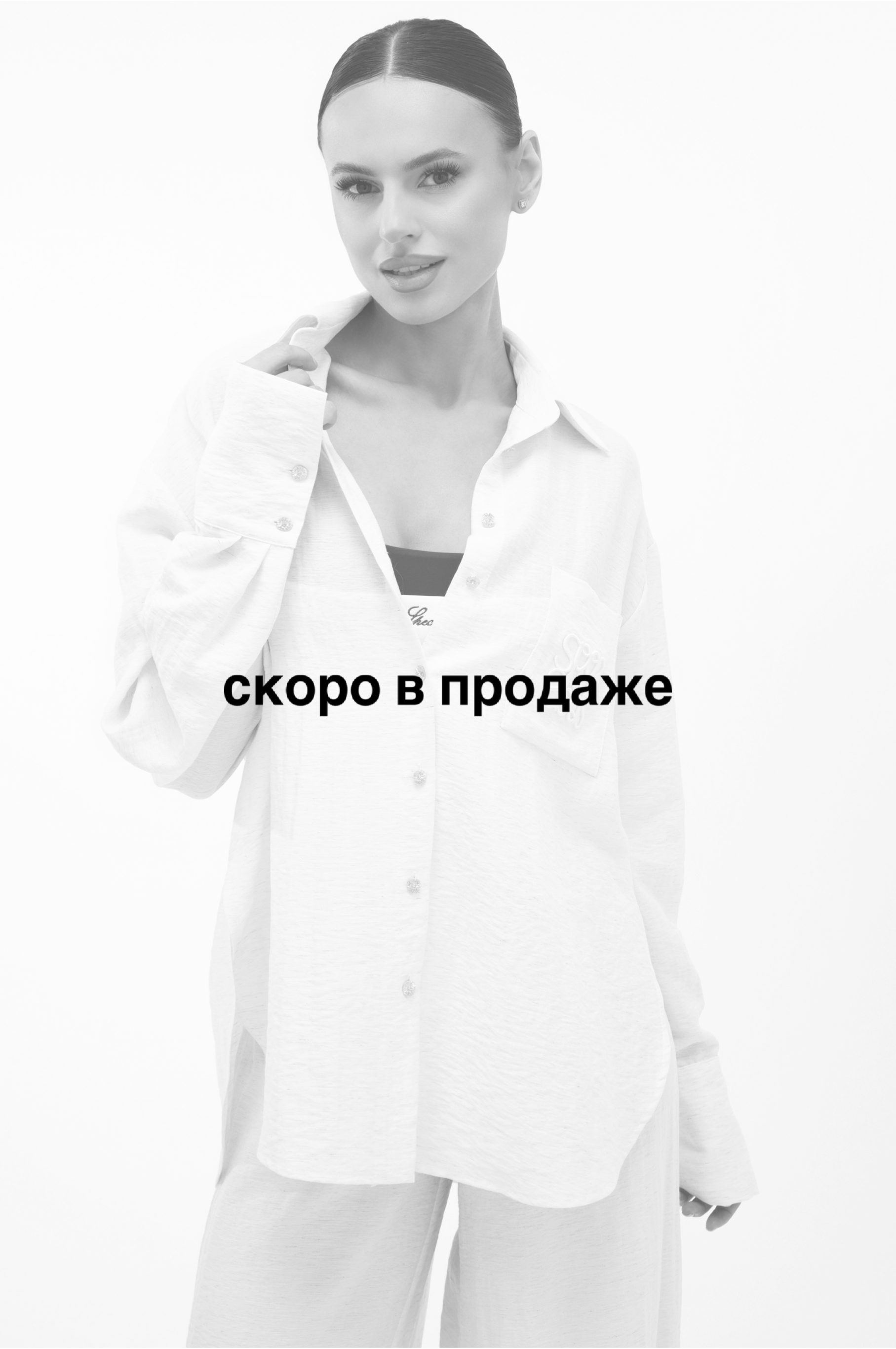 Универсальный дизайн позволяет носить рубашку свободно, подвязывая или драпируя на талии. Костюм дополняют изящные золотые пуговицы и фирменная объемная вышивка на кармане.
