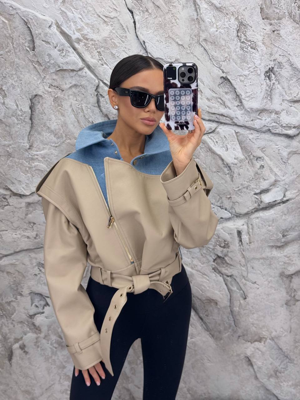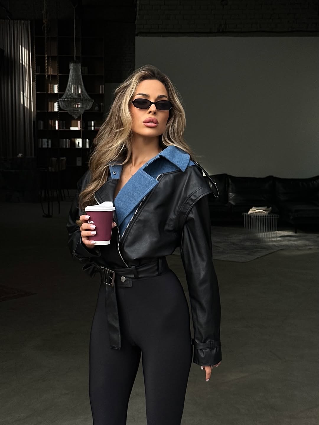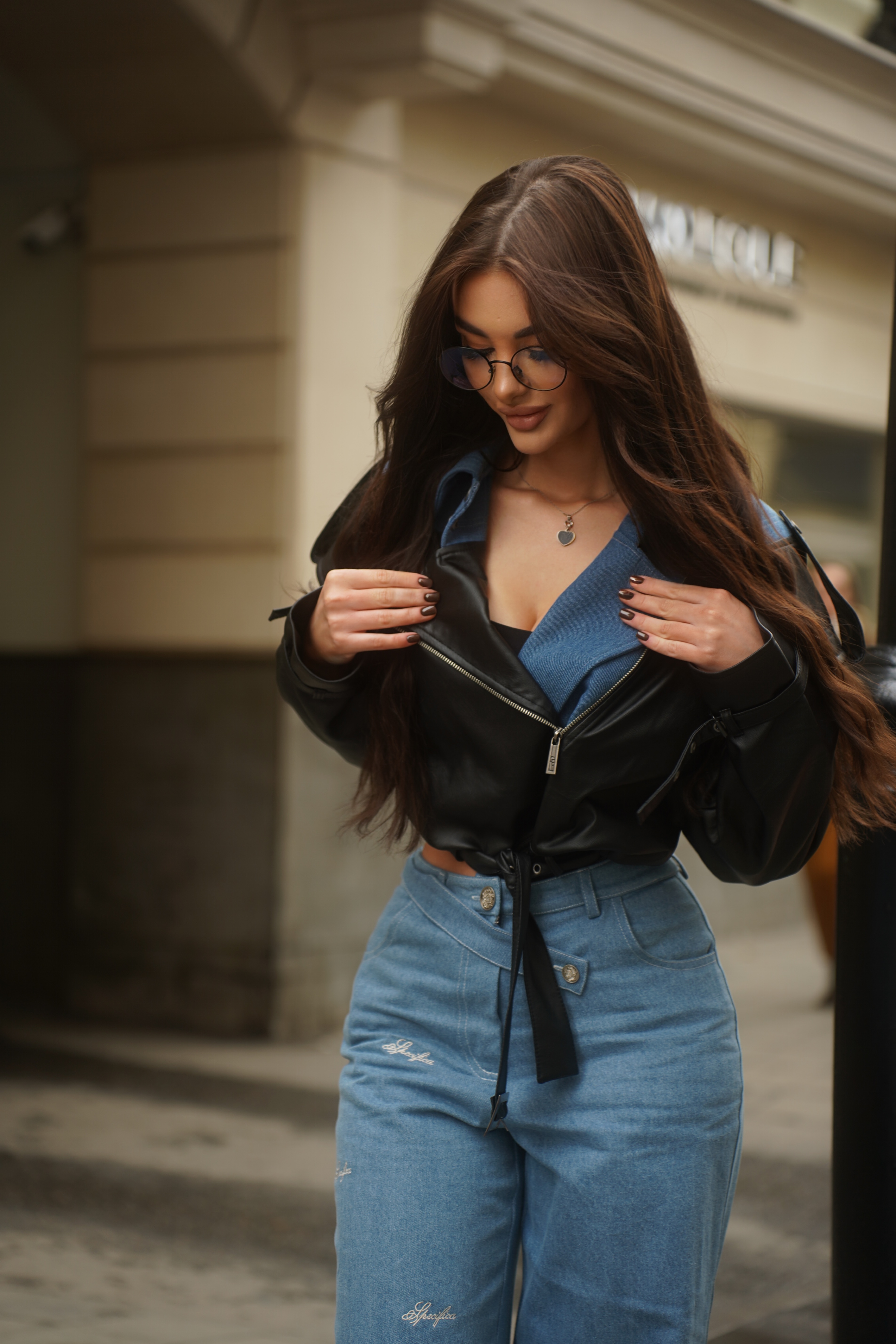 Комбинированная косуха состоит из комбинации джинсового материала и кожи.