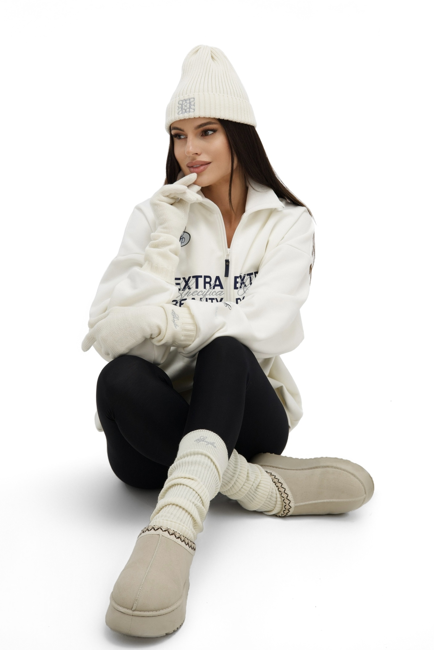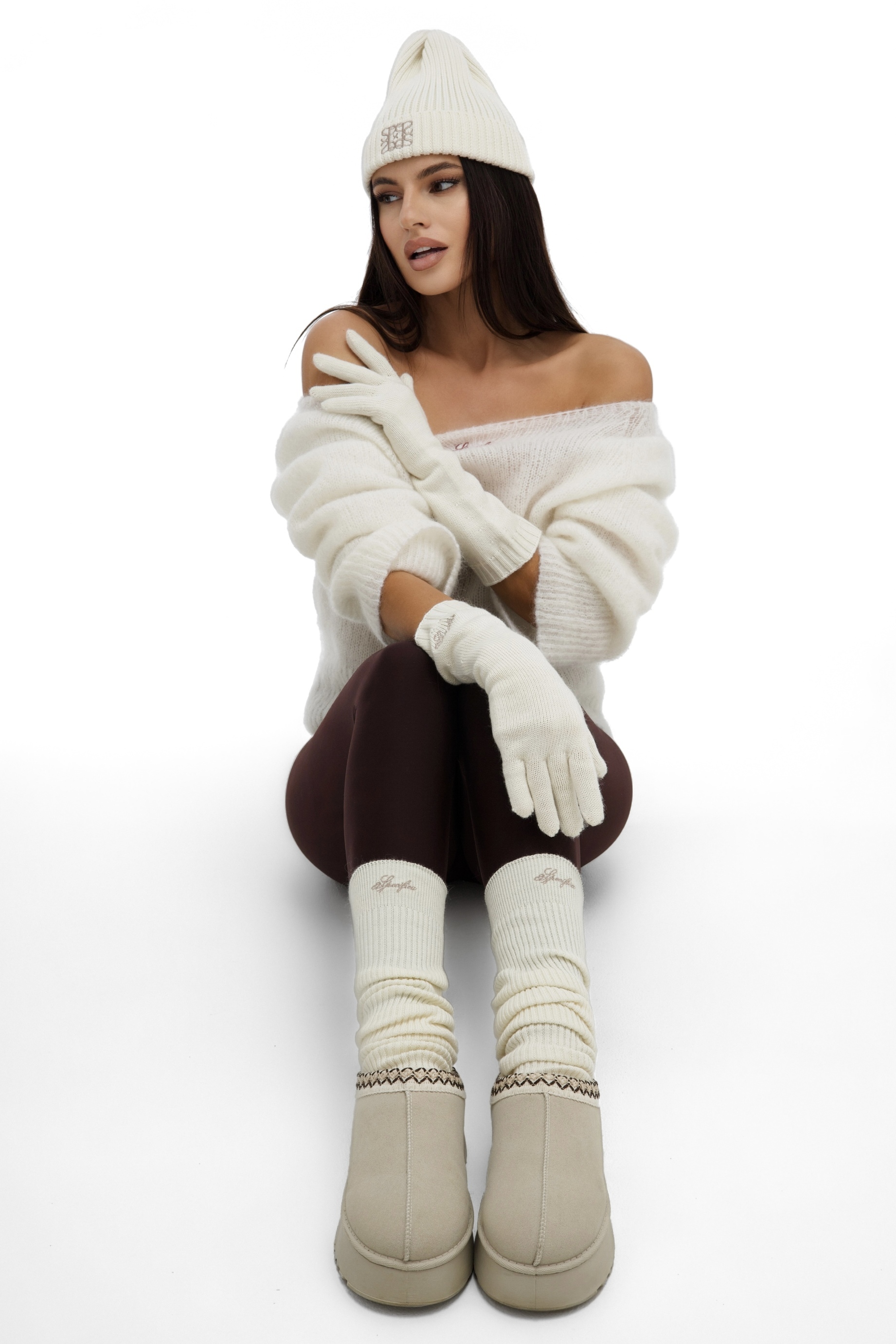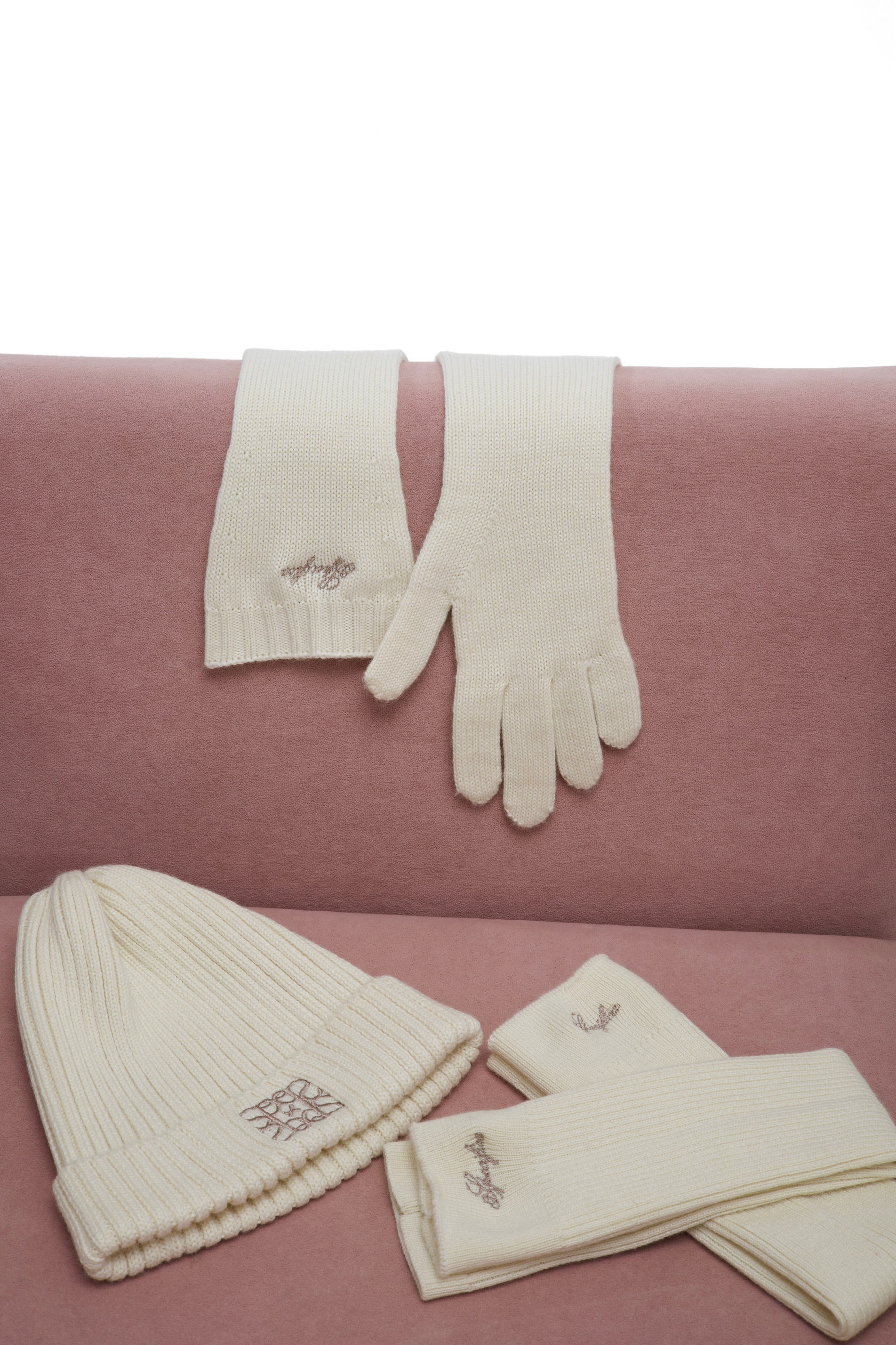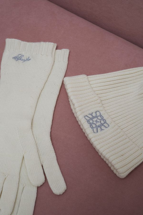 Перчатки представлены в четырех цветах с контрастной вышивкой логотипа бренда, которая также дублируется на шапках.