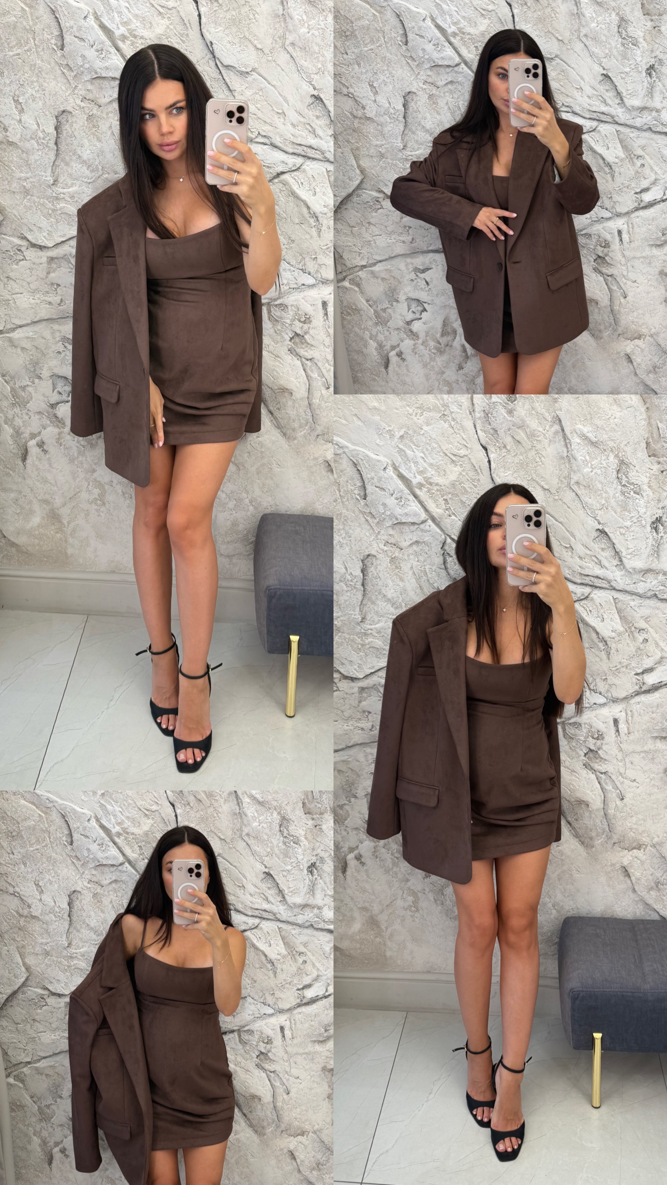Выполнено из мягкой замшевой ткани, которая отлично тянется и обтягивает фигуру, подчеркивая все достоинства.