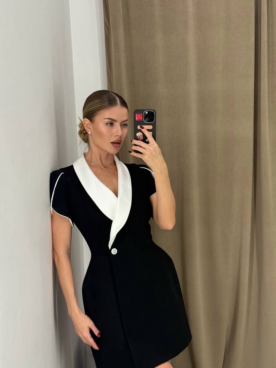Необычные рукава и изящный воротник придают образу особую утонченность и изящество, а приталенный силуэт с акцентной пуговицей создает эффект фигуры песочные часы, подчеркивая вашу женственность и грацию.