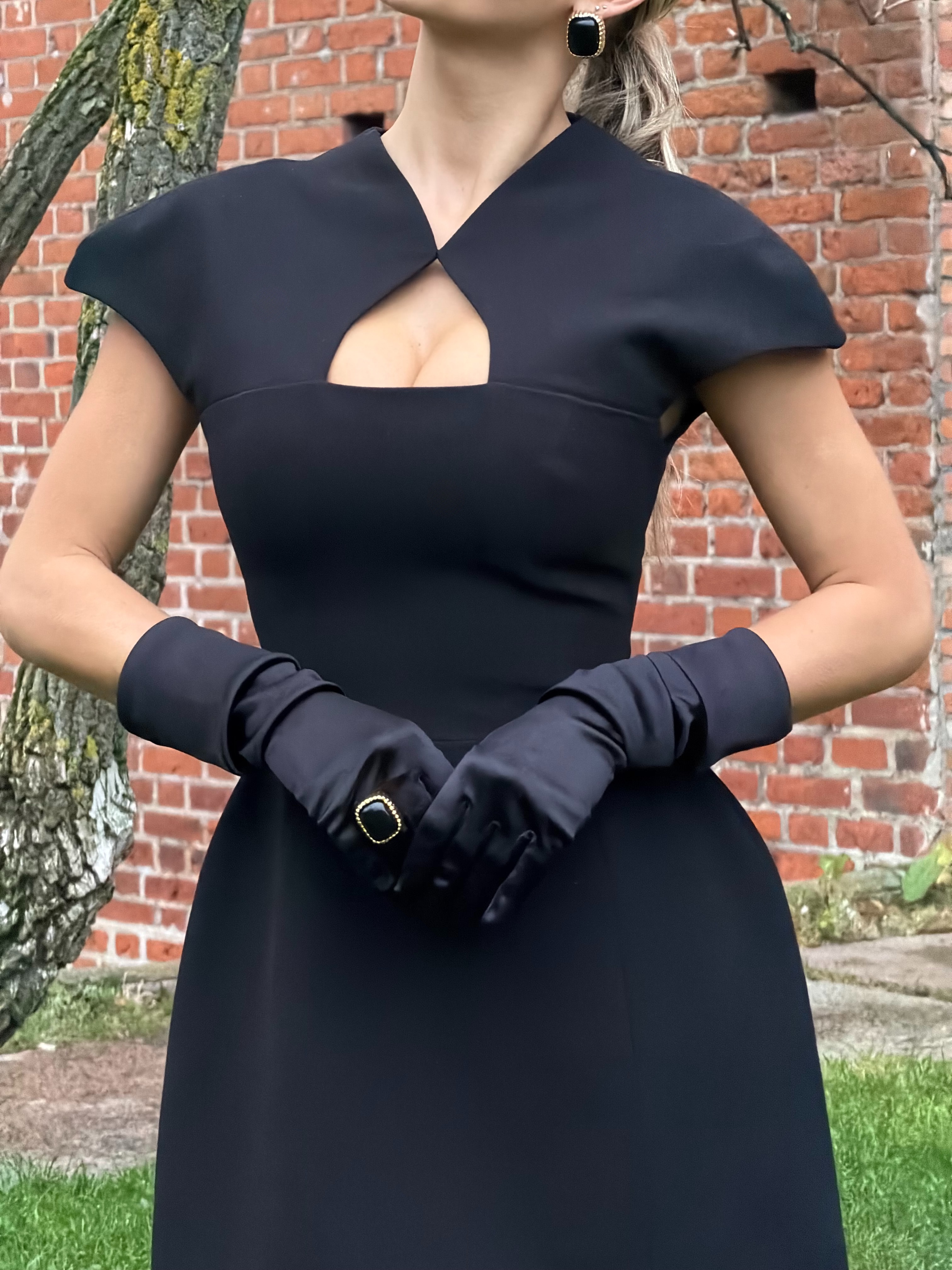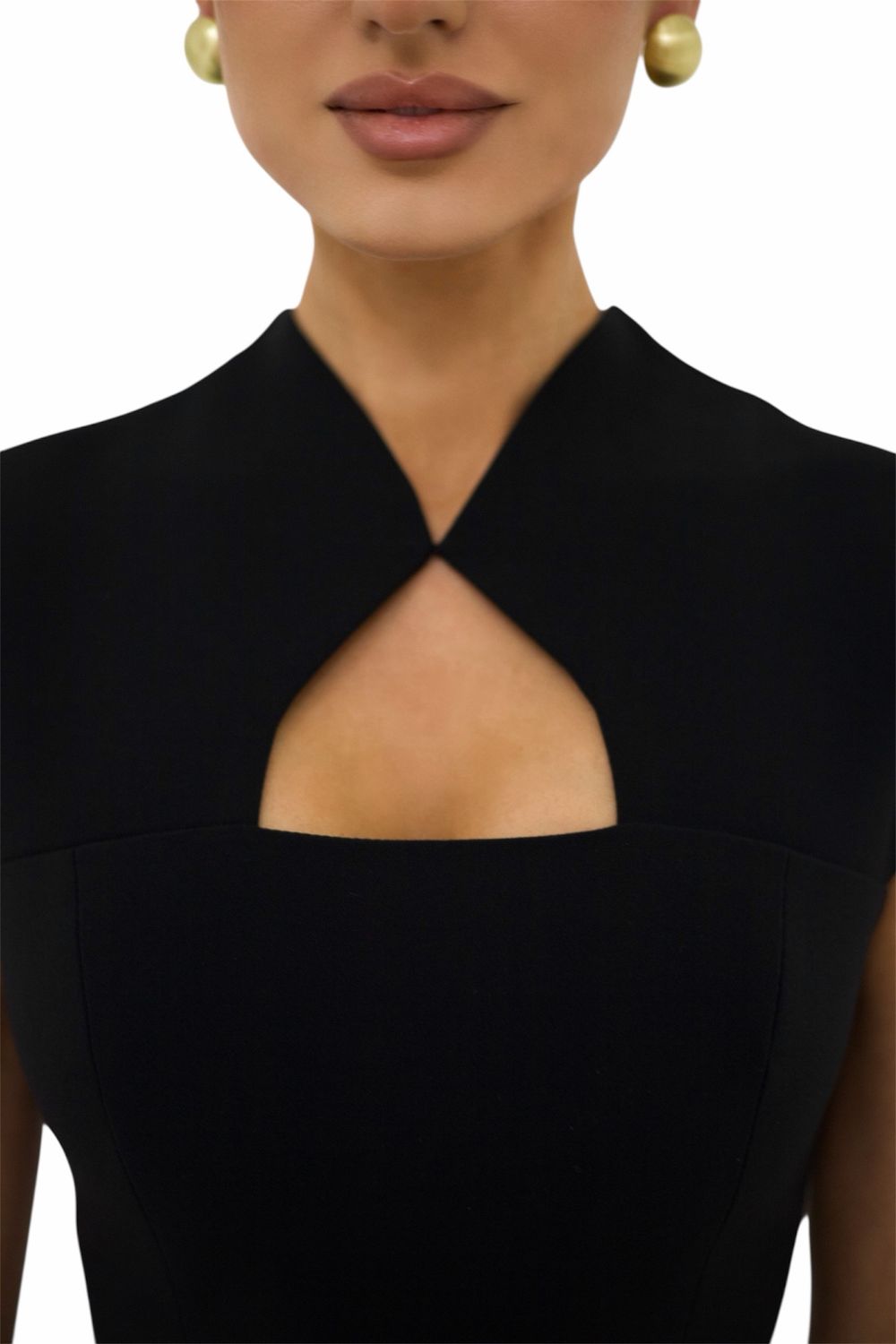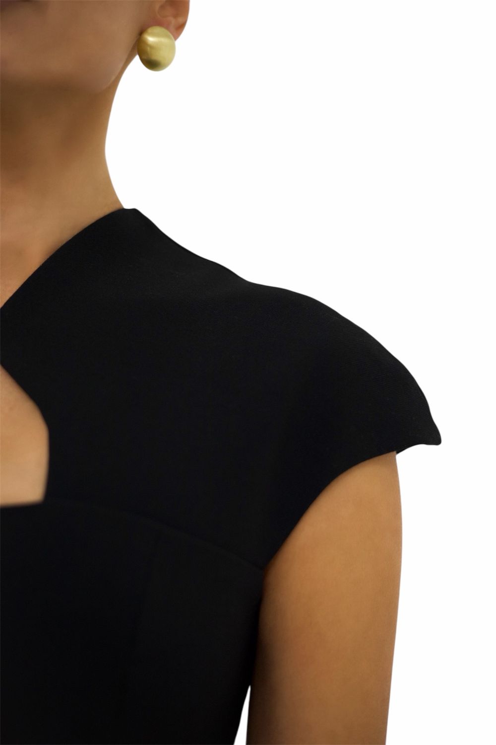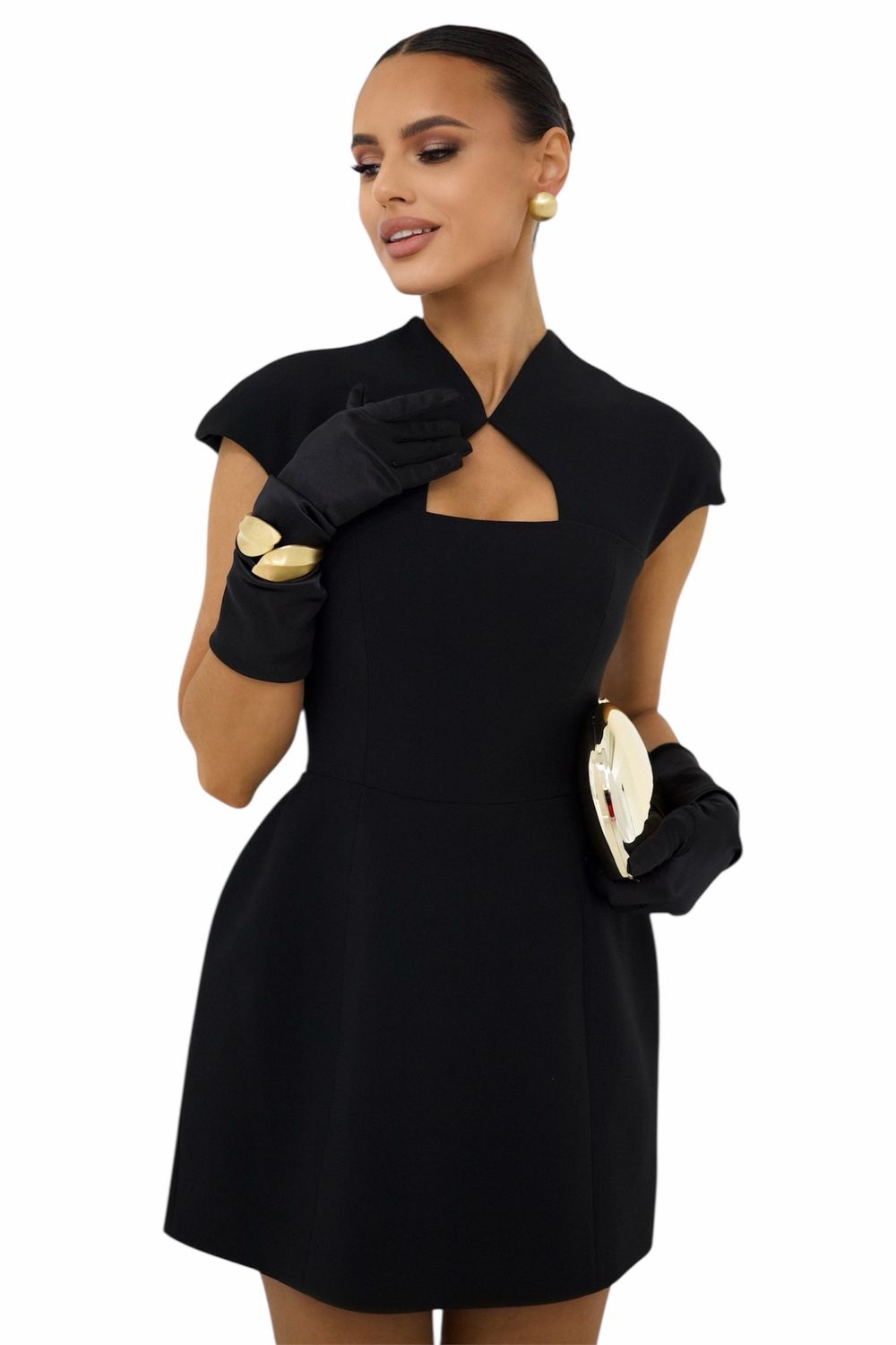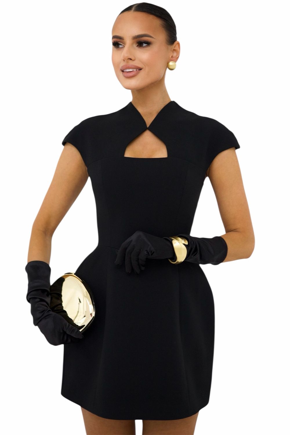Модель с коротким рукавом в виде кейпа и треугольным вырезом на груди, который добавляет нотку дерзости и соблазна.