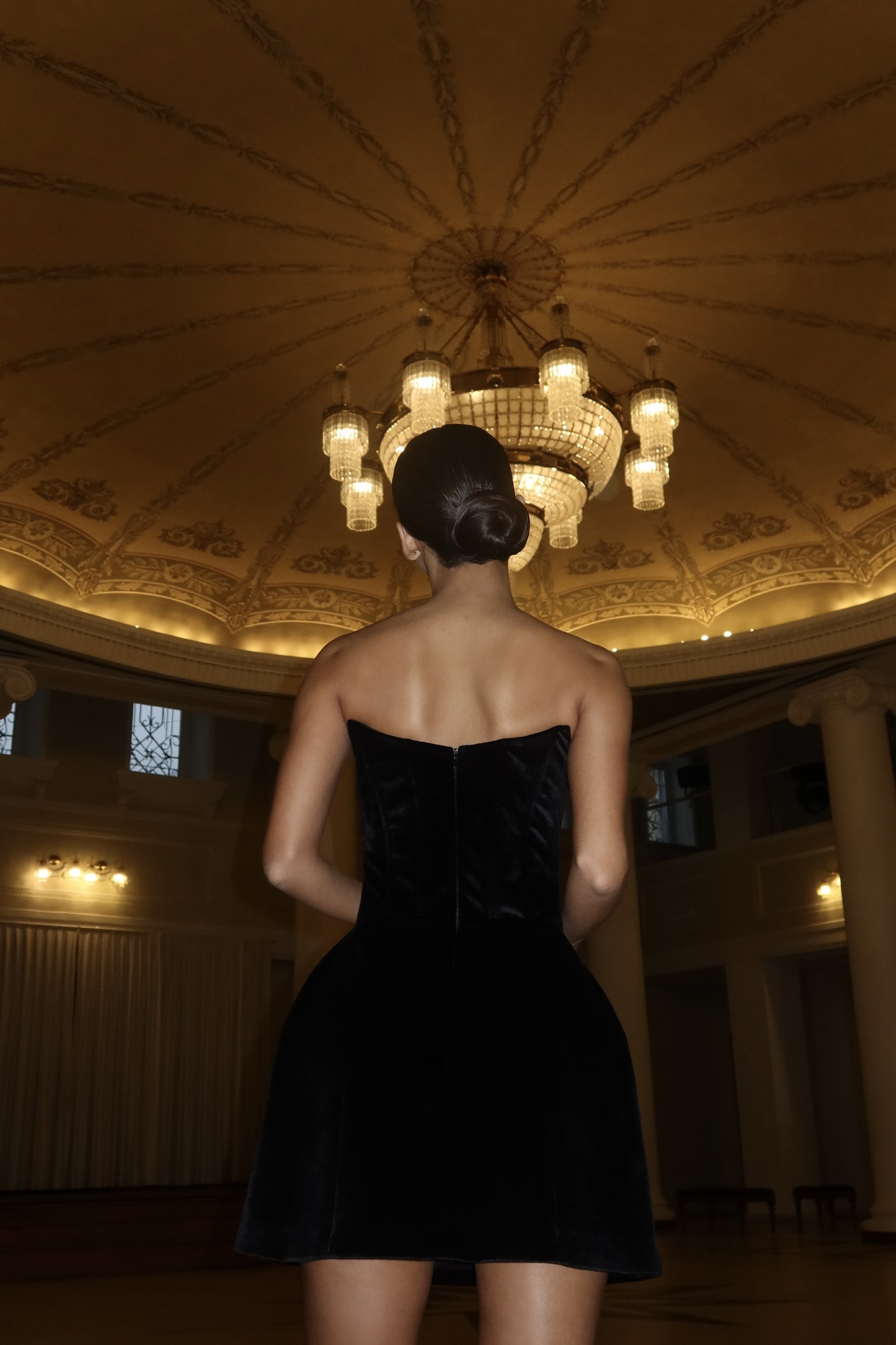 Платье из бархата черного цвета на корсетной основе по верху изделия, за счет чего красиво подчеркивается талия и зона декольте.