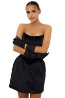 Платье из бархата черного цвета на корсетной основе по верху изделия, за счет чего красиво подчеркивается талия и зона декольте.