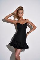 Черное мини платье по фигуре на бретелях и манящими объемными воланами по низу юбки - сделает ваш образ романтичным и украсит любой вечер.