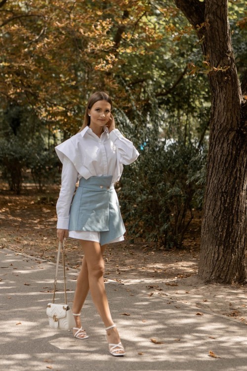 Спереди расположены пуговицы, которые позволяют регулировать глубину выреза и по своему усмотрению менять общий стиль наряда.