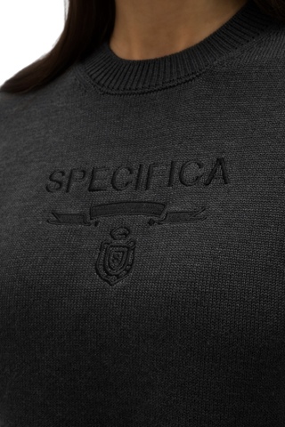 Фактурное изделие имеет завышенную талию и свободный крой к низу.
