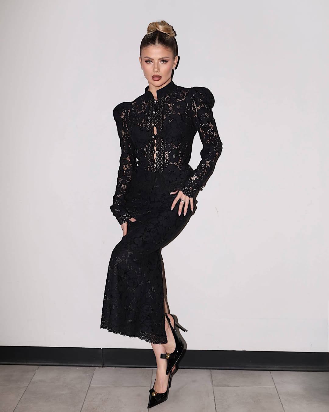 Сзади расположен легкий разрез, придающий походке изящную динамику, а низ украшает тонкая кайма из хлопкового кружева — словно воздушное завершение образа.