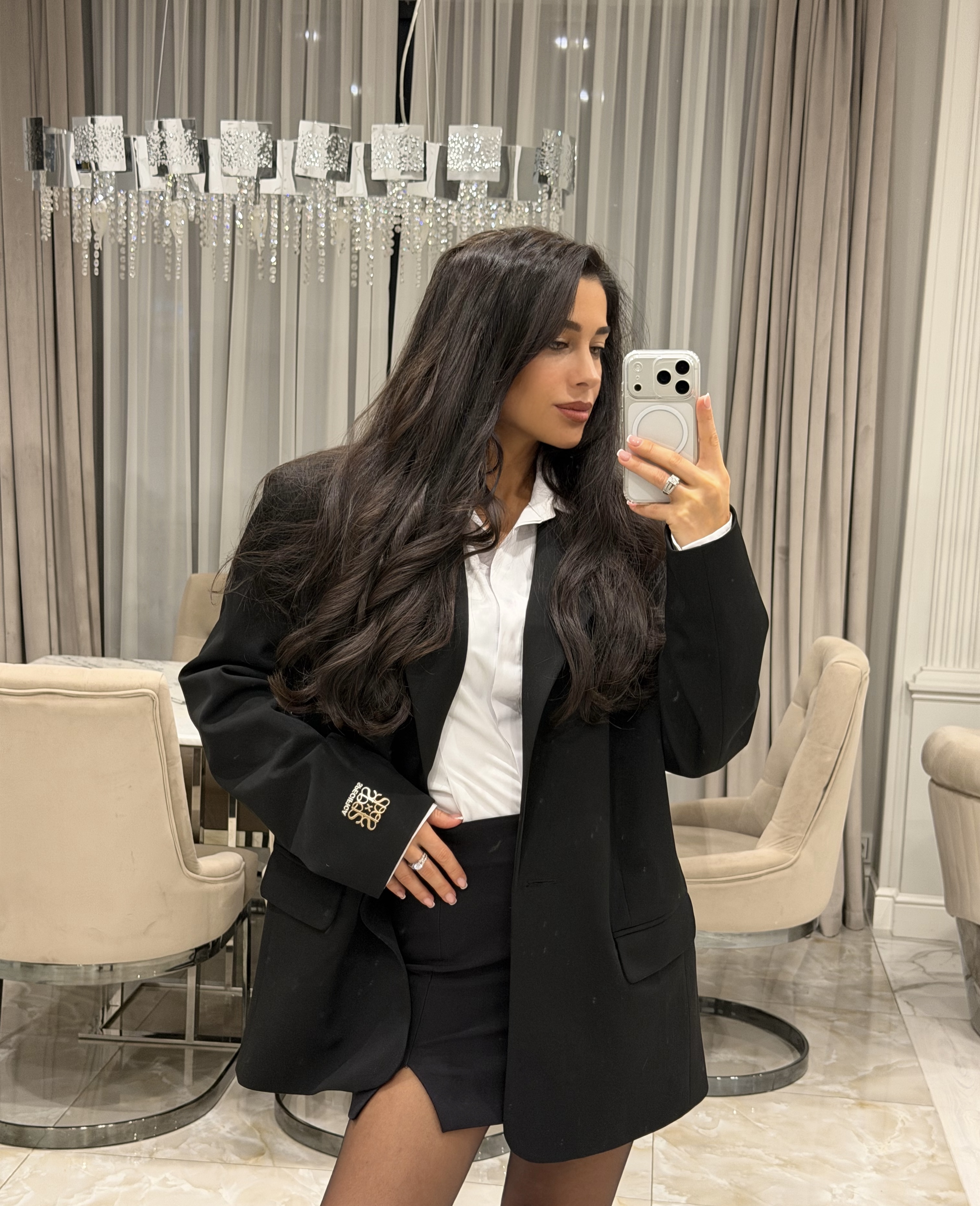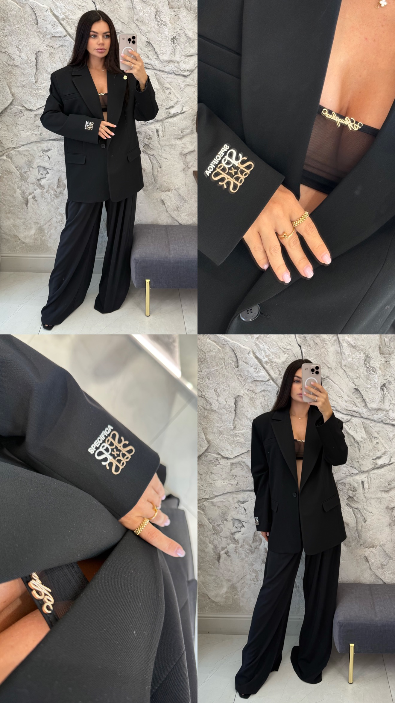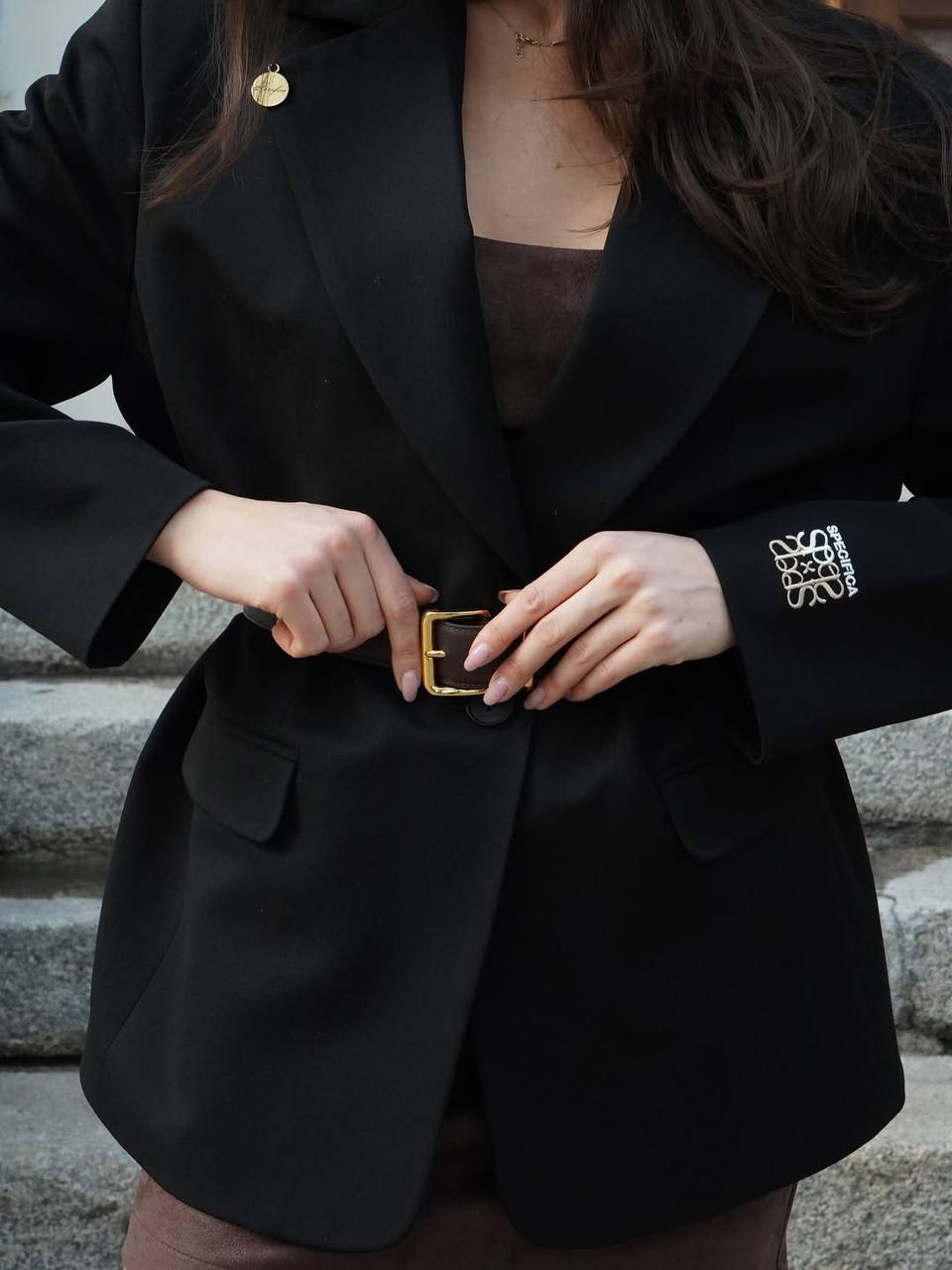 Жакет имеет длинный рукав, украшен современной вышивкой в новом стиле, и стильной брендированной металлической монеткой, он станет надежной основой для создания разнообразных образов.