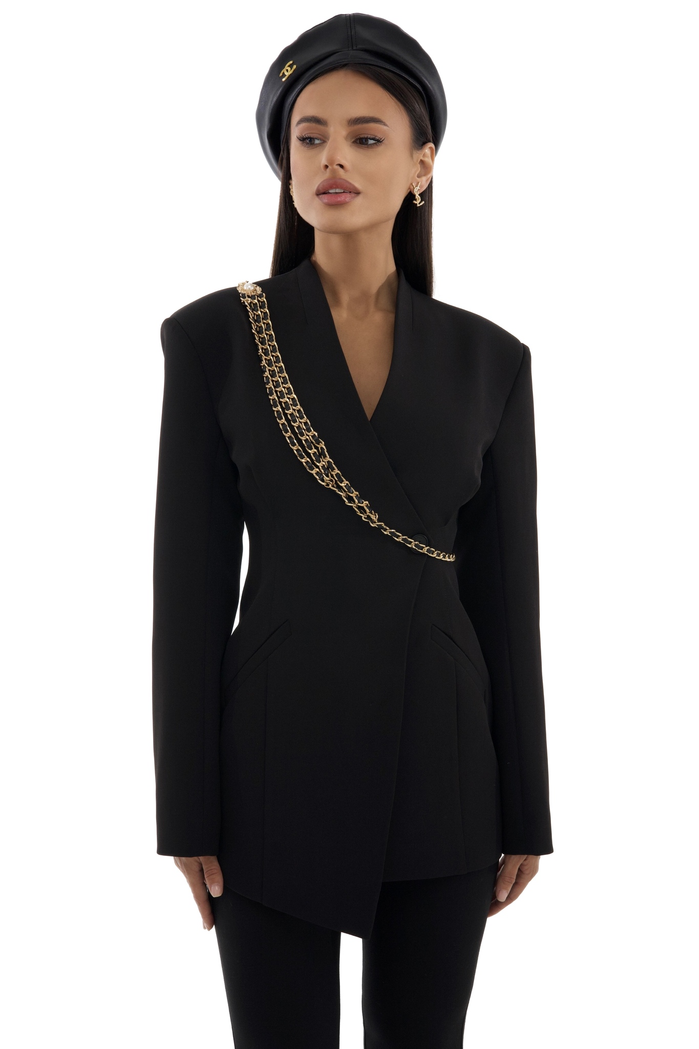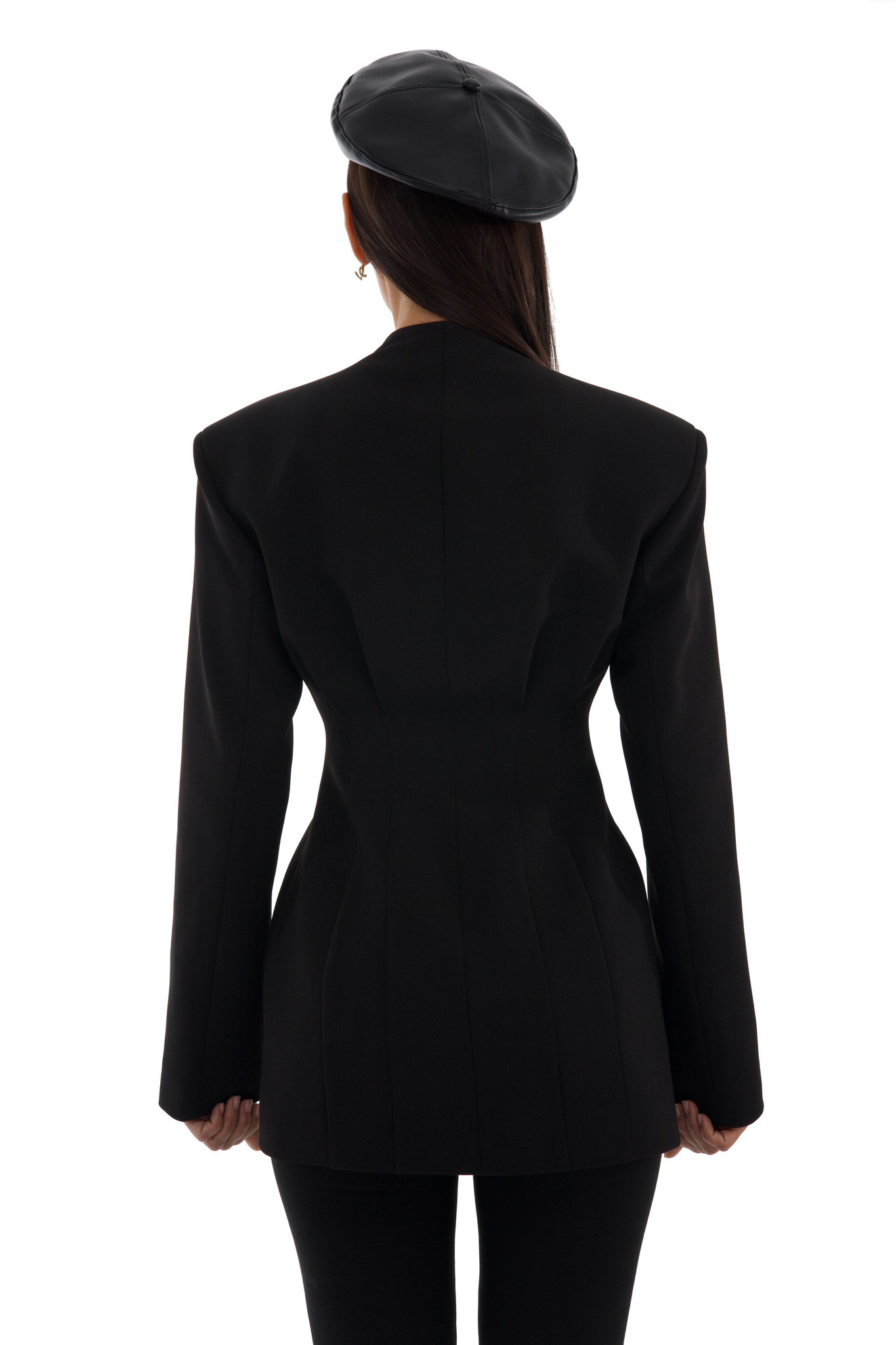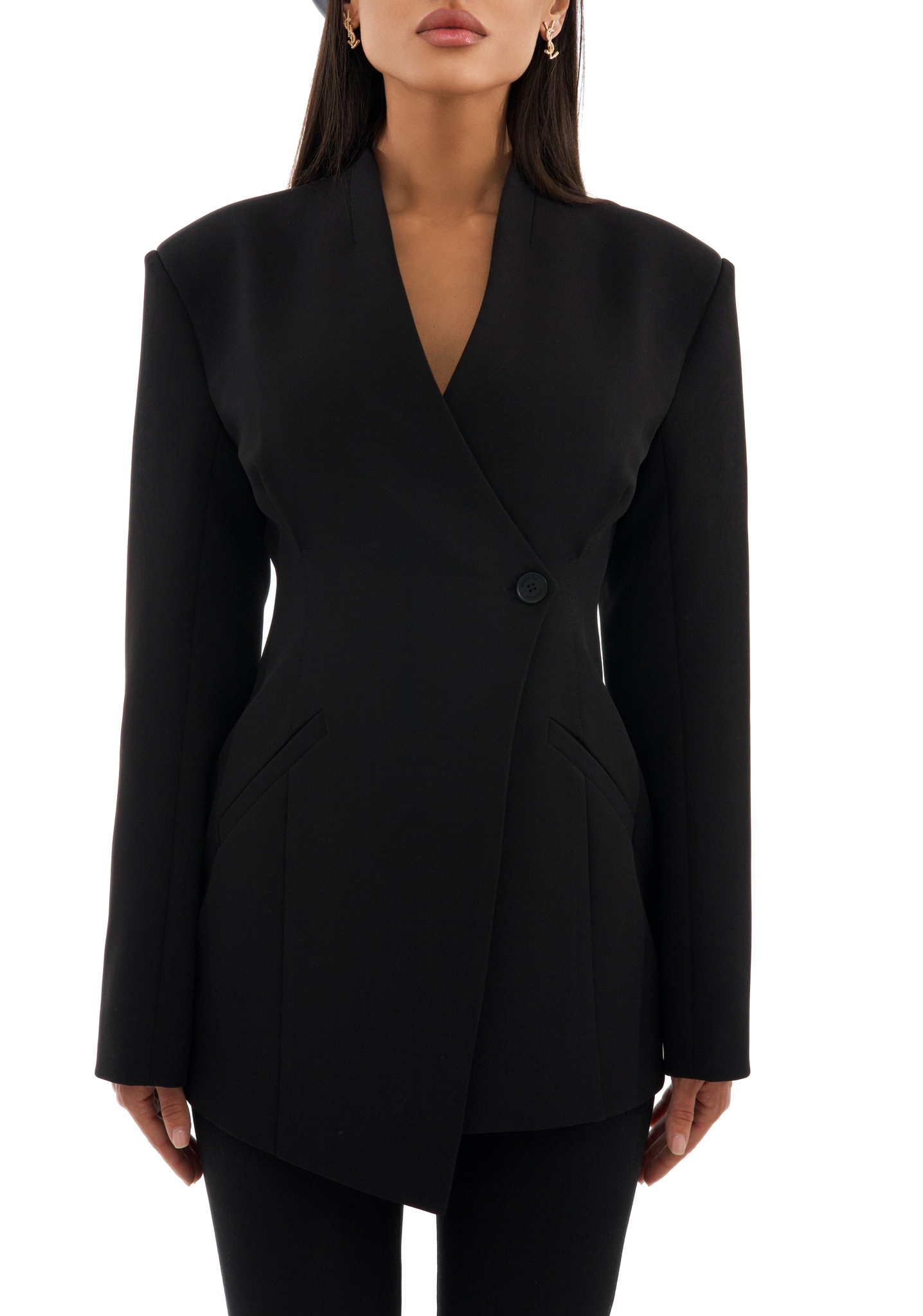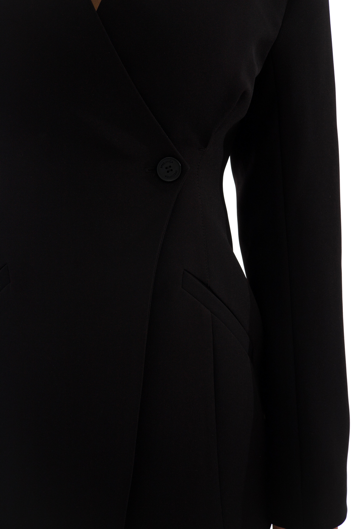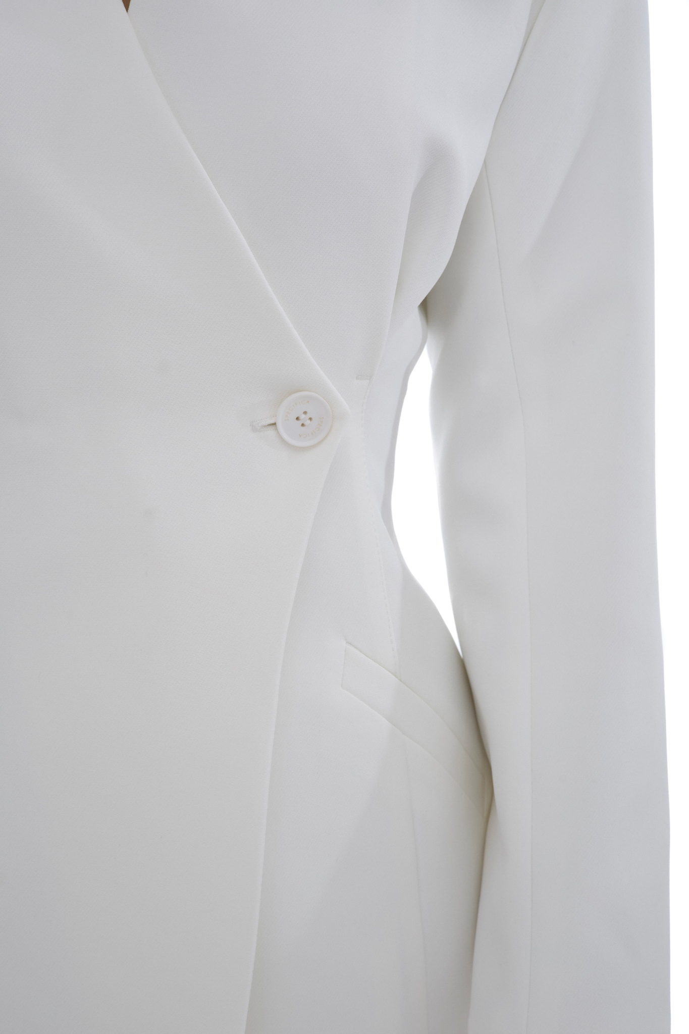 Жакет асимметричного кроя с V-образным вырезом, застегивается на брендированную пуговицу.