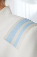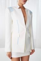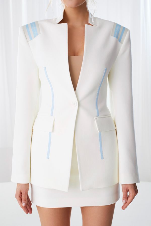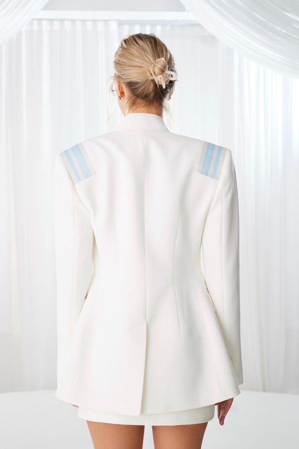 Мы добавили уникальные детали, которые делают этот жакет особенным: "Погоны" из жаккардовой ленты с фирменным логотипом, которые добавляют образу дерзости, итальянская репсовая лента, которая стильно подчеркивает талию, бронированные пуговицы, которые придают жакету индивидуальности.